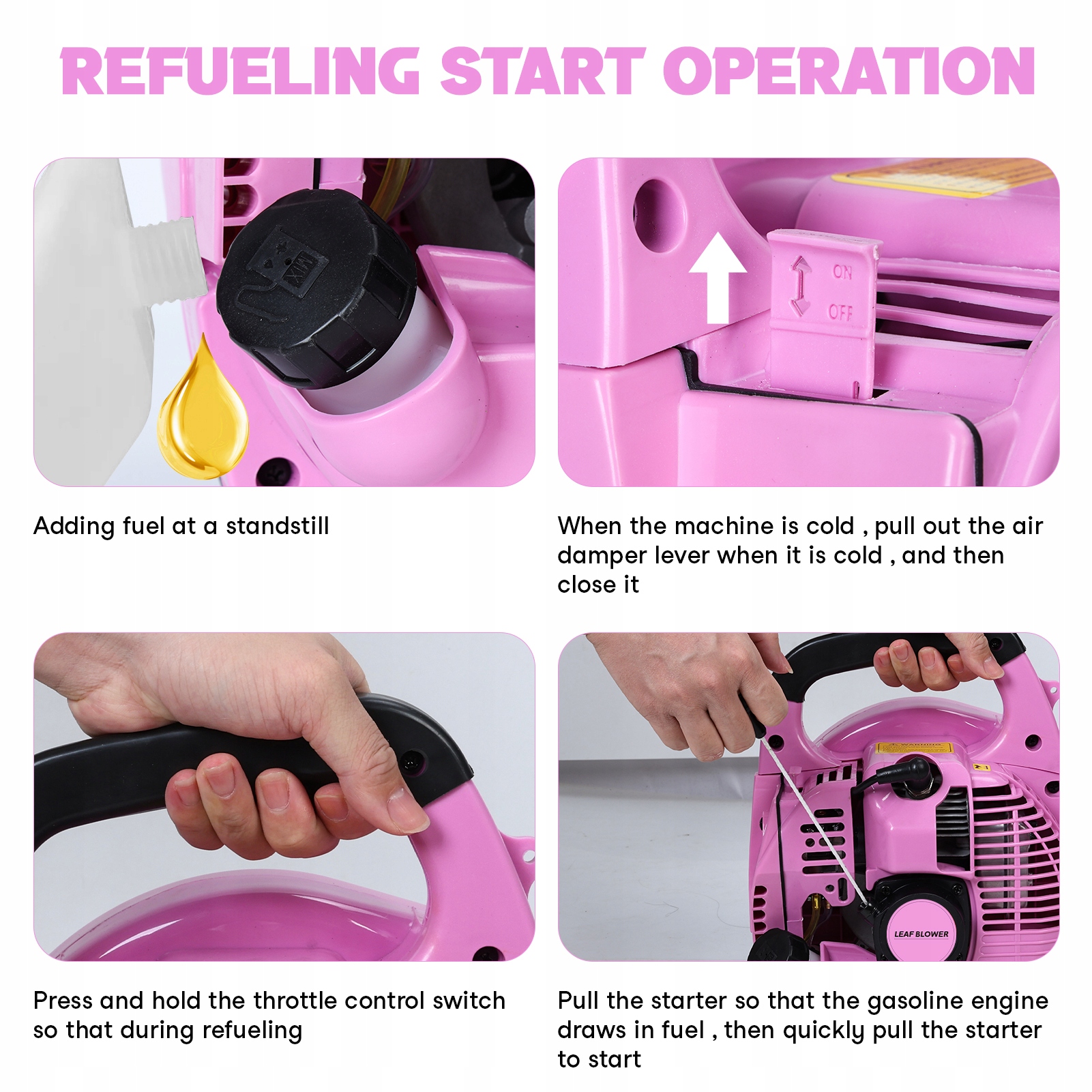 Використання простого стартера вирішує проблему важкого початку витягування, щоб і люди похилого віку, і жінки могли легко керувати машиною, і після очищення обережно натисніть на перемикач. Сніг та видалення снігу в теплиці, подвір’я, обслуговування доріг, видування пилу, очищення зеленого, шліфування, видування листя, що дме зварювальна швидкість, водонепроникна конструкція тощо.