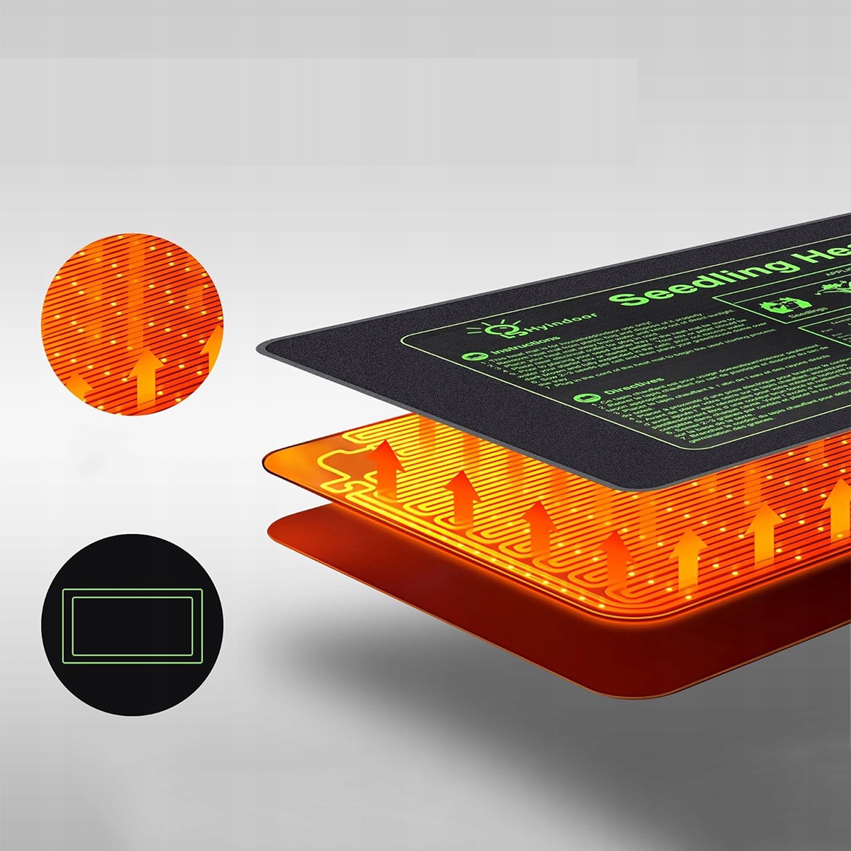 Зовнішній шар нагрівального килимка виготовлений із міцного ПВХ-матеріалу, а середні два шари виготовлені з високотемпературного ізоляційного шару ПЕТ із рейтингом водонепроникності IP67, що гарантує тривале використання в будь-яких умовах і забезпечує рослинам безпечне та комфортне середовище для ріст.