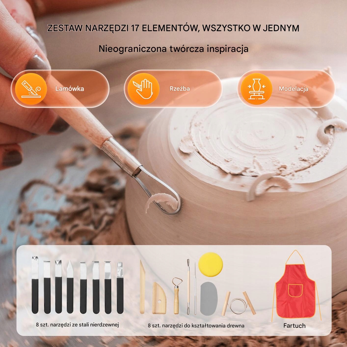 - набір інструментів різьблення 1 × 17 частин (8 інструментів з нержавіючої сталі, 8 дерев'яних)