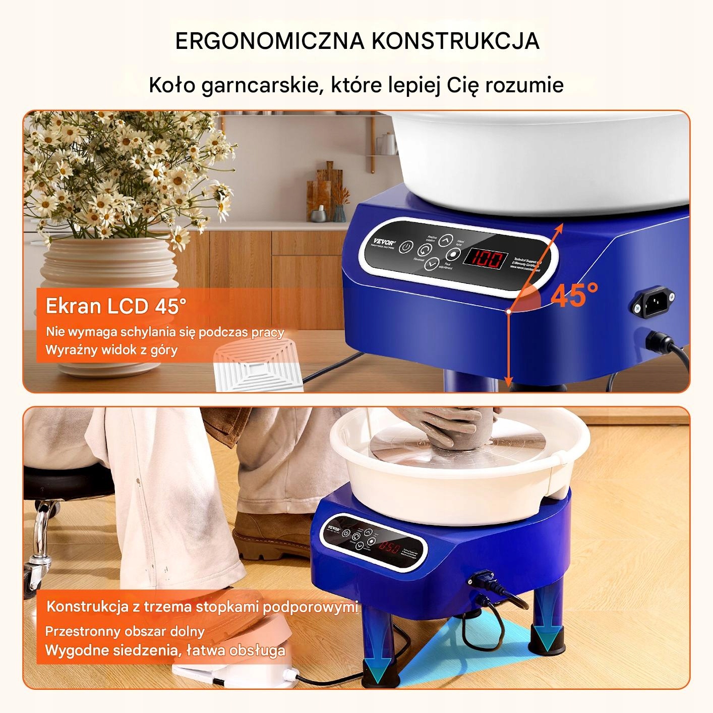 Створіть унікальні керамічні роботи з професійним гончарним колесом , що забезпечує стабільність, точність та повний контроль над процесом прокатки. Прямий привід гарантує плавний оборот як на низьких, так і на високих швидкостях, мінімізуючи ризик деформації керамічних форм. РК -сенсорний екран та Педаля стопи дозволяє легко регулювати обертання та напрямок повороту, що дозволяє отримати повну свободу роботи.