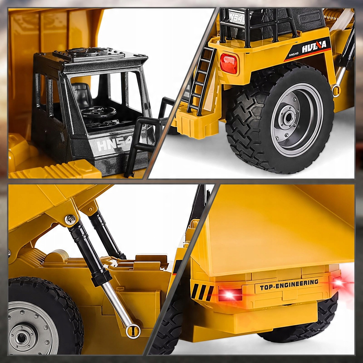 🟡 🟡penne смішні функції та реалістичні деталі --- Після завантаження піску, каменів або ґрунту у великий контейнер ви можете швидко дістатися до будівельного майданчика, переміщуючи суцільну мотузку за шкалою 1:18, використовуючи контроль. Коли ви будете готові до вивантаження, натисніть кнопку управління, щоб підняти і залишити трохи. Ця велика іграшкова вантажівка також оснащена миготливими вогнями для розвідки. 4 Структура сигналу 2,4 ГГц, максимальний контрольний діапазон 50 м. Бездротовий пульт дистанційного керування надає користувачеві повний контроль над користувачем без обмежень. Цей дитячий смітник з індикаторами має інтерактивну зону завантаження, яка дозволяє вільно підняти та опустити. Вантажівка знаходиться за шкалою 1:18.
