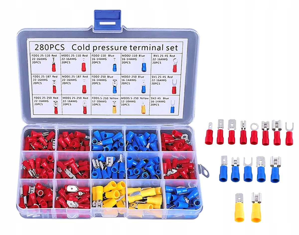 Набір 280 ізольованих з'єднувальних з'єднувачів. 15 типів роз'ємів, відсортованих в окремих камерах. Зручний, компактний випадок з відсіками запобігає змішуванню гвинтів. Усі палати корпусу підписані, що полегшує пошук правильного пристосування. Роз'єми запобігають надмірному згину проводів та їх корозії, забезпечують хорошу ізоляцію.