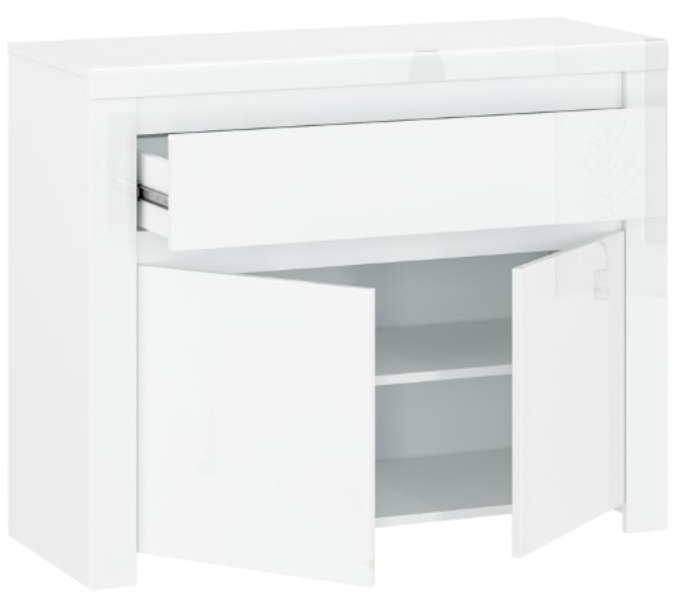 Комод став незамінним елементом обладнання кожного будинку. Цей з колекції LINGO ідеально підходить для облаштування таких приміщень, як: вітальня, вітальня, хол, спальня, офіс, домашній кабінет або молодіжна кімната. Класична форма колекції в універсальному білому кольорі надає ряд можливостей для облаштування практично будь-якого інтер'єру у вашому домі. Простора шухляда, зручні полиці та блискучі білі фасади роблять комод LINGO ідеальним доповненням до обстановки вашого дому. Колекція меблів LINGO задовольнить кожного шанувальника бездоганної простоти в сучасному виконанні.