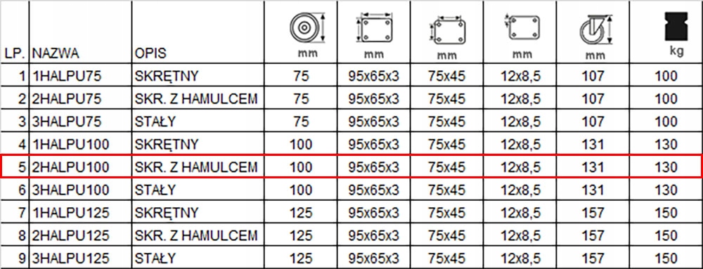 Колеса на плиті з гальмом, код 2HALPU100K2, в таблиці під позицією 5.