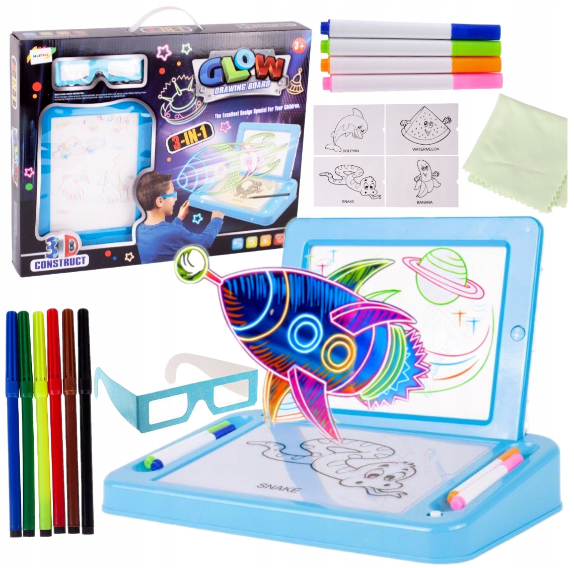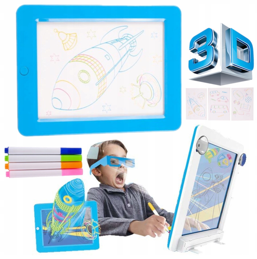 Чарівна дошка 3D подарує неймовірні емоції як дітям, так і дорослим. Щоб створити малюнок з 3D-ефектами, вставте один із шаблонів на дошку та обведіть зображення на прозорому екрані. Потім найкраще піти в темну кімнату, надіти 3D-окуляри з комплекту і включити підсвічування дошки. Тоді вийде чудова картина, яка порадує кожного маленького художника.
