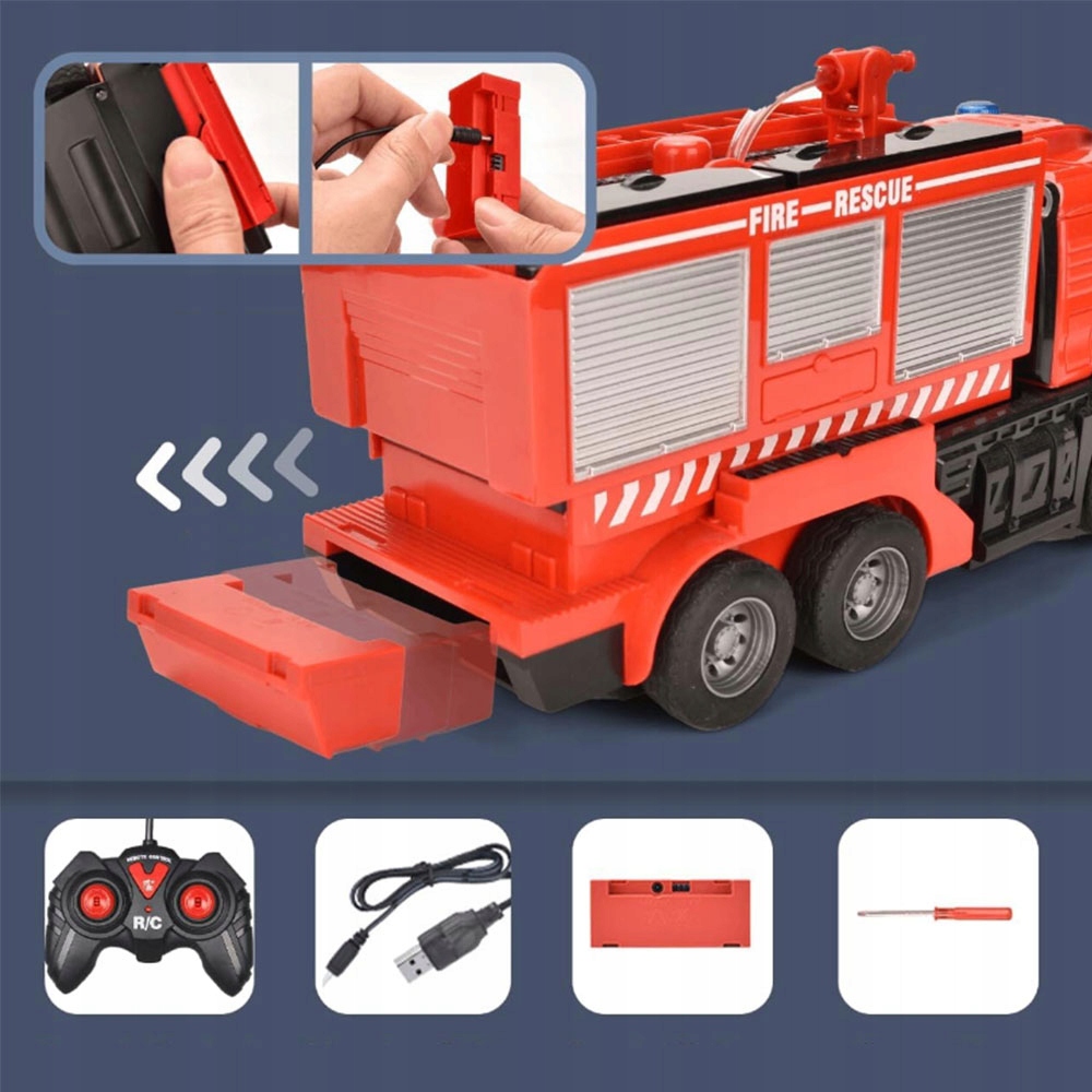 Пожежна машина для хлопчиків на дистанційному керуванні може рухатися вперед, назад, повертати ліворуч або праворуч. Відстань дистанційного керування становить близько 15 м, а час автономної роботи становить 20-30 хвилин. Для пульта дистанційного керування потрібні 2 батарейки типу АА 1,5 В. Пожежна машина оснащена літієвим акумулятором 3,7 В. Просто натисніть на задню частину автомобіля, щоб вийняти акумулятор і зарядити його через кабель USB.