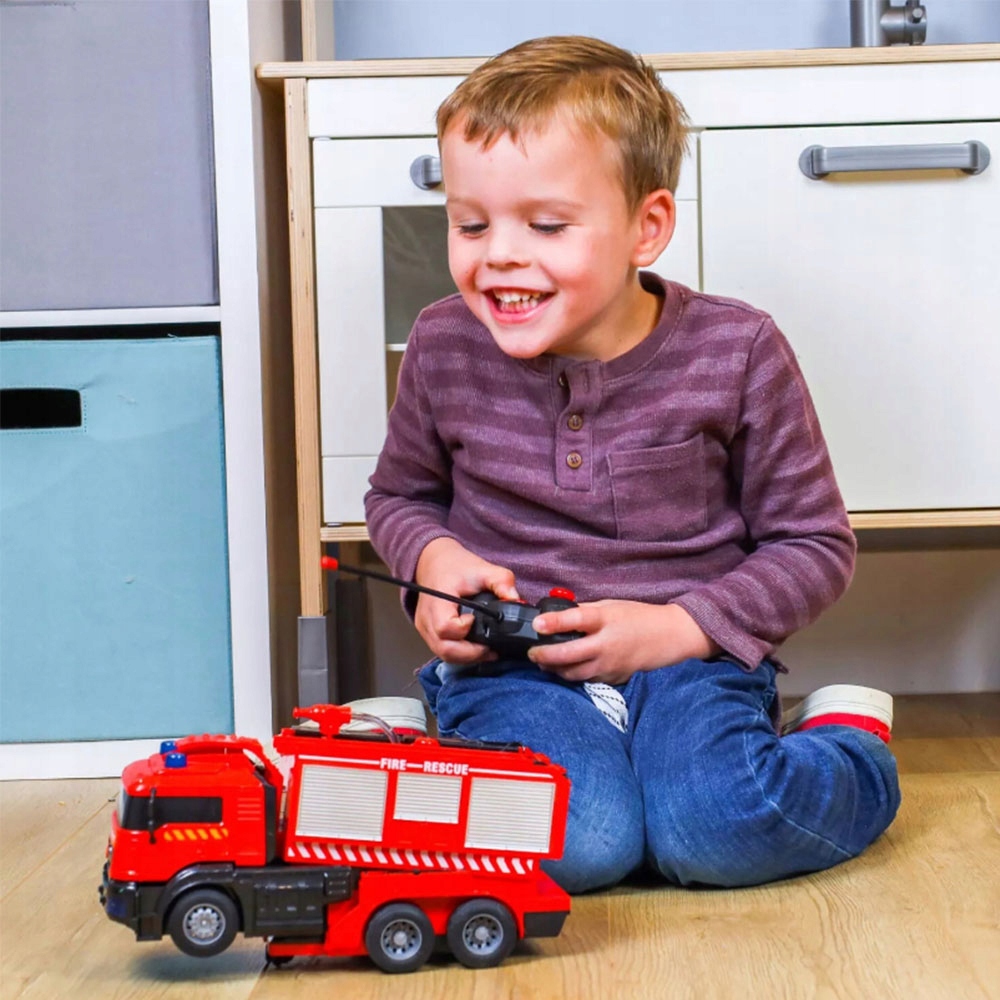 Пожежна машина має ксенонові світлодіодні фари, і одним натисканням кнопки пожежна машина може розбризкувати воду. Поверніть перемикач на третю передачу, щоб увімкнути режим швидкої допомоги, і з’явиться реалістичний звуковий ефект для кращого враження від пожежника. Ідеально підходить для дітей, які можуть уявити, що вони рятують світ.