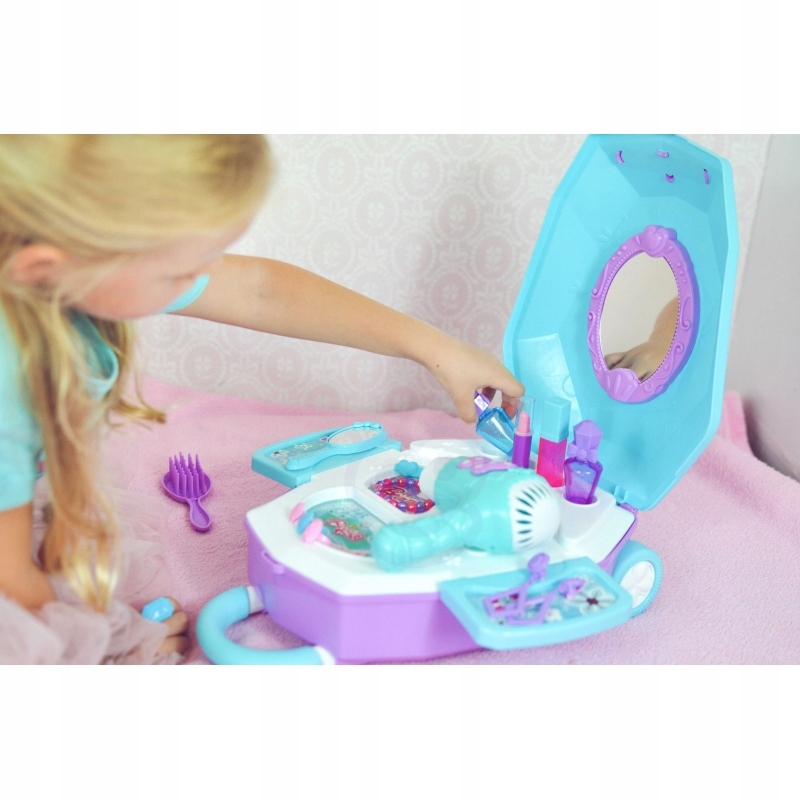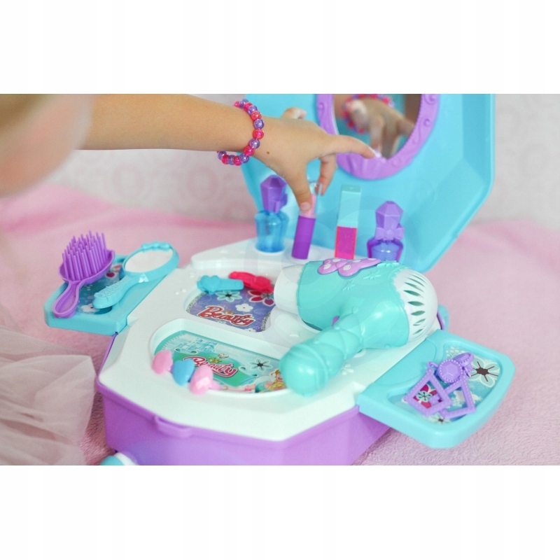- Туалет для дівчинки 2in1 салон краси в валізі від бренду Woopie - ідеальна пропозиція для всіх маленьких принцес. Завдяки цьому наборі, дитина може відчувати себе справжньою принцесою і має все, щоб підготуватися до великого м'яча або виходити з друзями. Всередині валізи є дзеркало та складка туалетного столика. Окрім аксесуарів, таких як дзеркало, манжети або пензлик, набір також має сушарку для акумулятора, яка діє як справжній - дме з повітрям. Косметика та інші аксесуари чудово відтворюють справжні предмети, які дозволять вам грати маленьку принцесу!