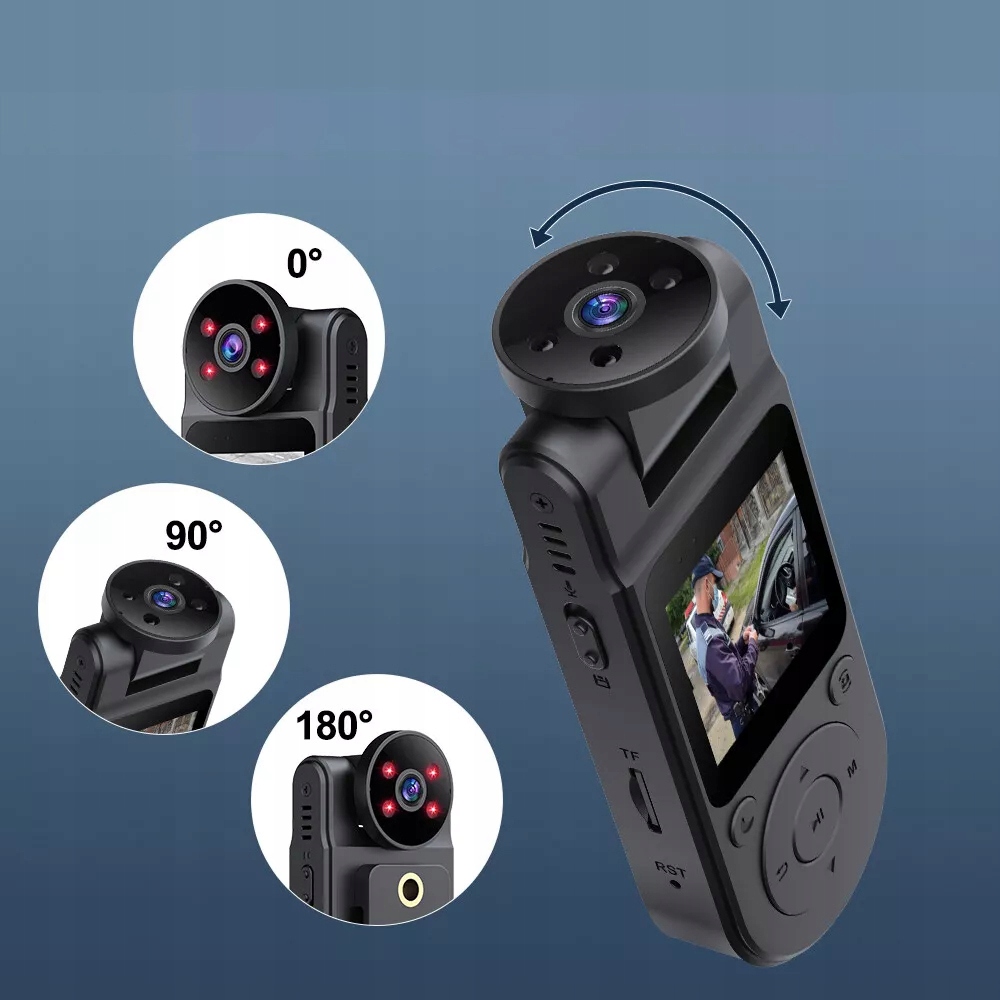 ☑ обертова лінза з 180 ° : об'єктив камери корпусу може бути відрегульована в діапазоні 0-180 градусів, адаптувати напрямок об'єктива до ваших потреб, переконуючись, що камера корпусу з аудіо та функціями запису відео не записується під неправильним кутом.