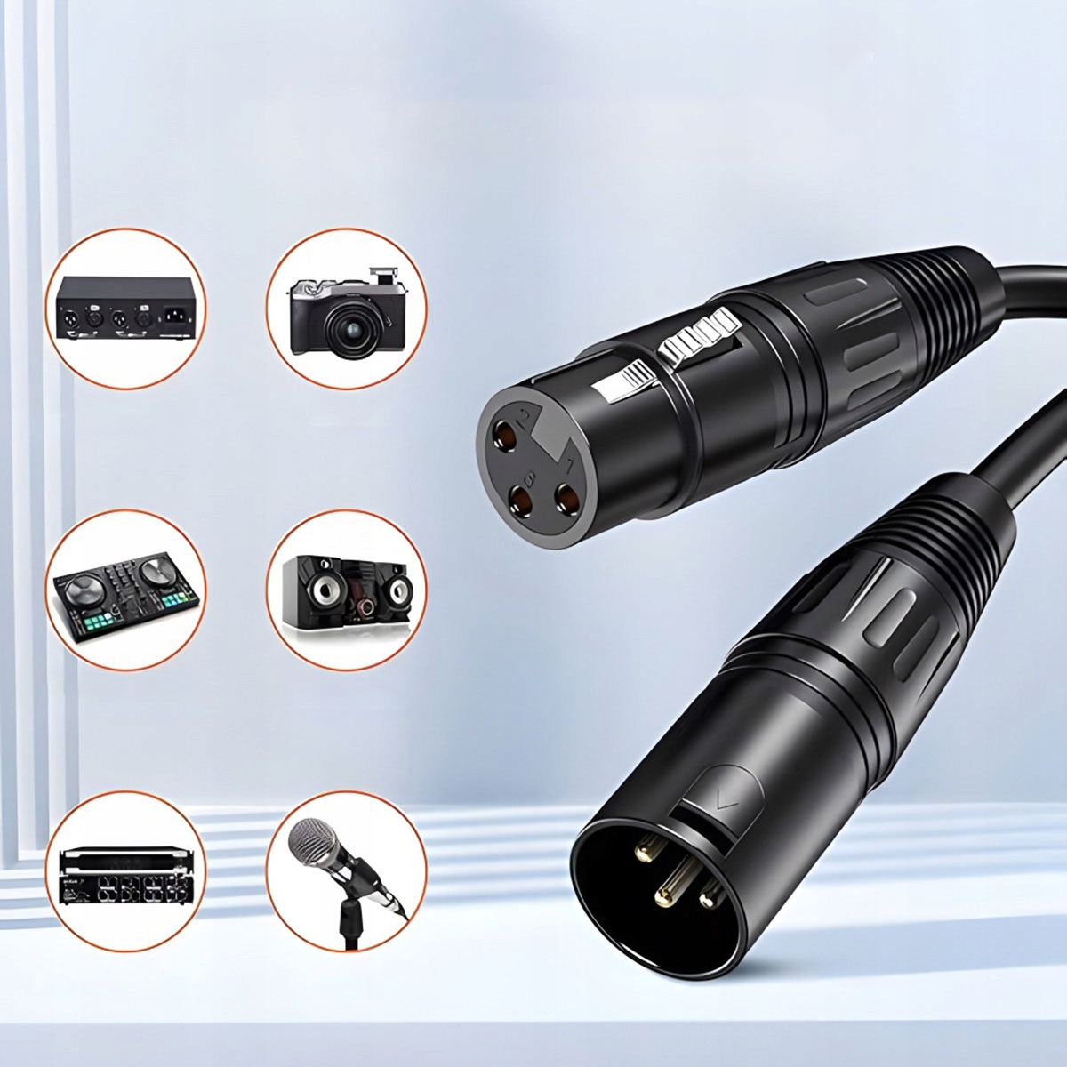 - DJ Essential: 1 м / 2 м XLR DMX-кабель (штекер/гніздо) для різних освітлювальних приладів сцени: рухомих, парних, прожекторів, верхніх ліхтарів із входом і виходом XLR.
