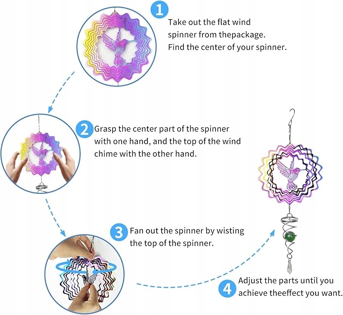 Простота у використанні: Металева вертушка має діаметр приблизно 14,5 см/5,7 дюймів і загальна довжина 40 см/15,75 дюймів, що забезпечує комфортне використання. Вітровий дзвінок оснащено S-подібним гачком, який дозволяє легко повісити його на стіни, вікна, двері, дерева, балкони, сади або де завгодно.