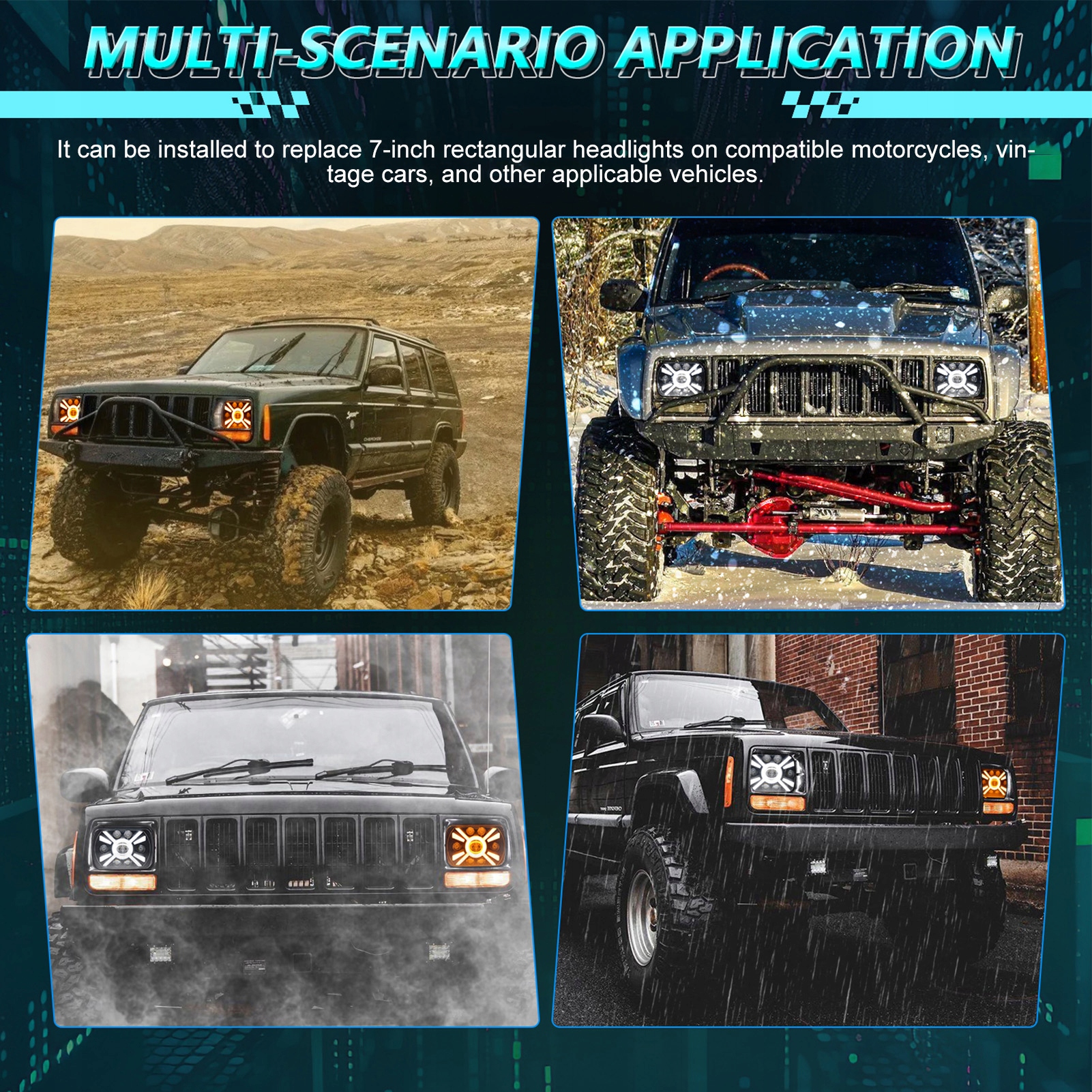 5. Широка сумісність: Ця 7-дюймова світлодіодна фара вписується в будь-який транспортний засіб, який використовує прямокутні світильники 5x7 або 7x6 дюймів. Завдяки його сильній пристосованій, вона легко замінює старі заводські світильники, пожвавлюючи зовнішній вигляд автомобіля.