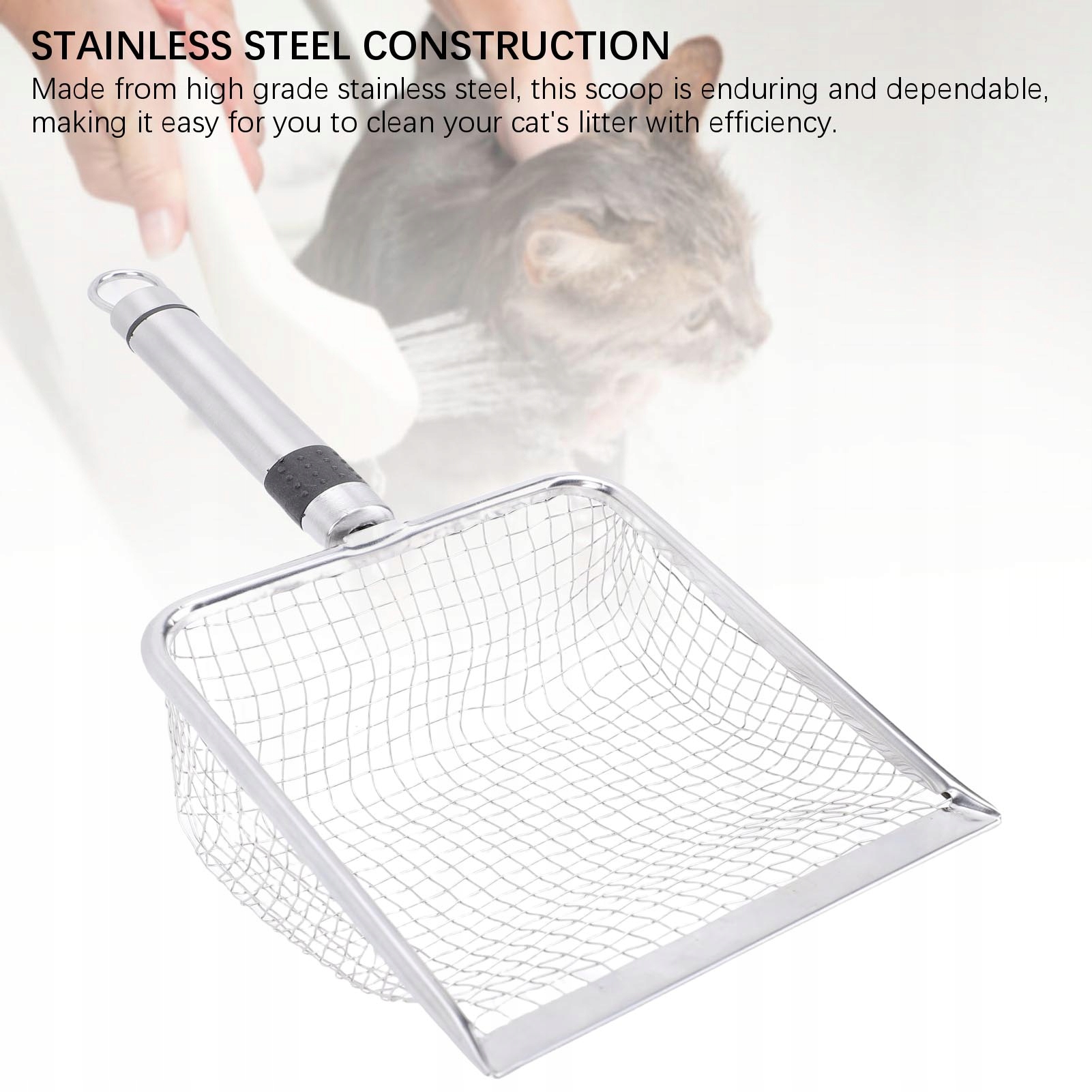 1. Конструкція з нержавіючої сталі: виготовлена з високоякісної нержавіючої сталі, ця вимірювальна чашка міцна і надійна, що полегшує очищення сміття кішки з ефективністю.