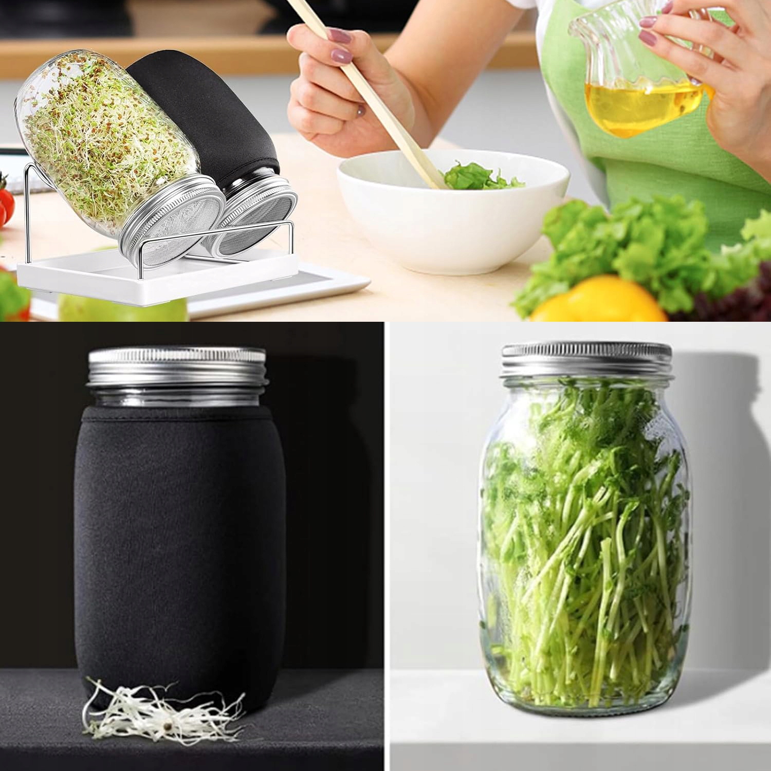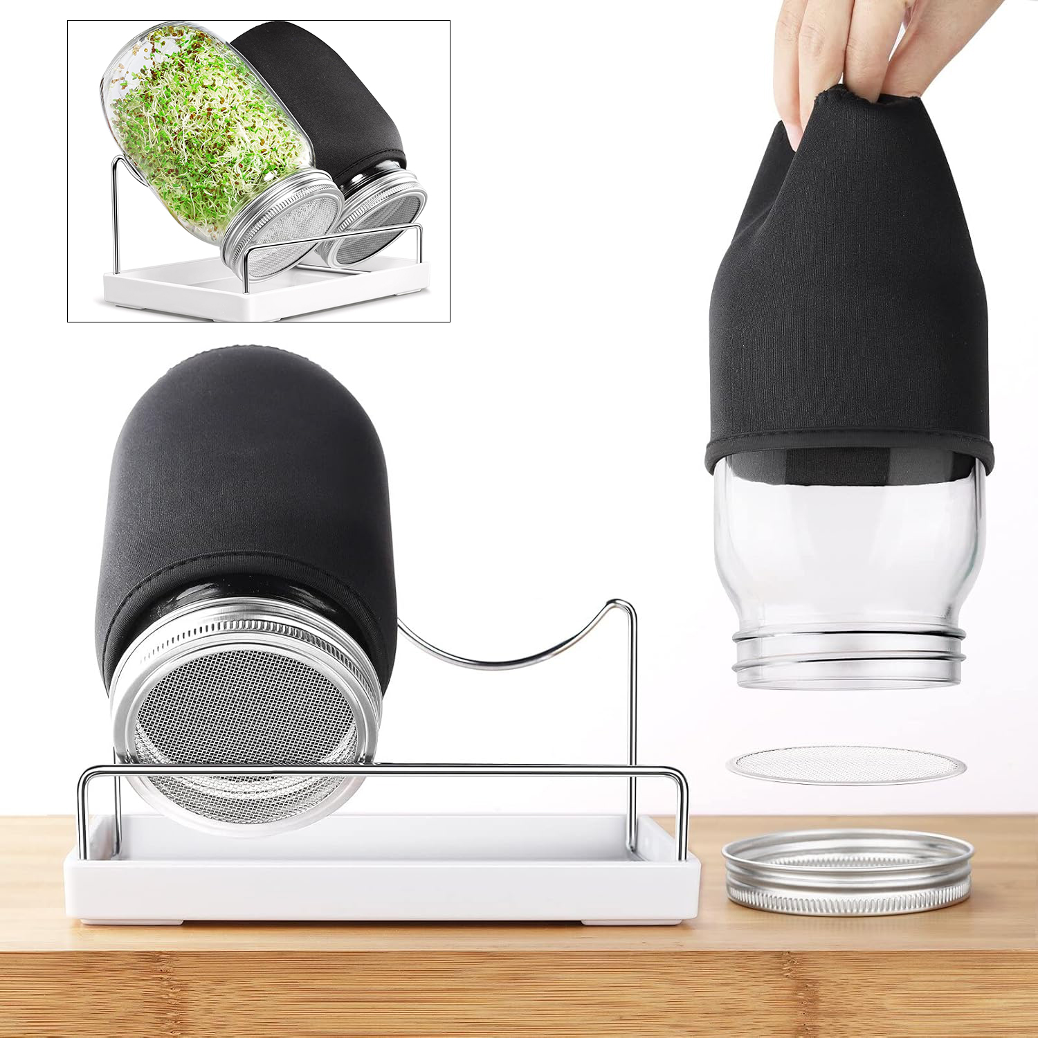 - - набір містить усі аксесуари, необхідні для вирощування паростків. Набір включає 2 затінені кришки тканини, 2 скляні банки, 2 кришки з нержавіючої сталі, 1 лоток та 1 підставка (насіння не включені). 4 4 4 4