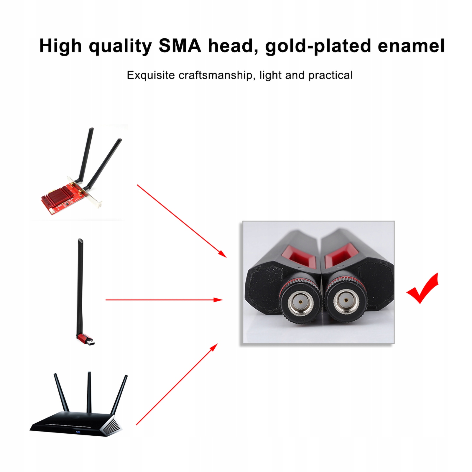 1. Голова SMA високої якості, окислення перенесення золота, жодне затемнення, кращий контакт, може покращити сигнал модуля мережевої картки Wi -Fi.