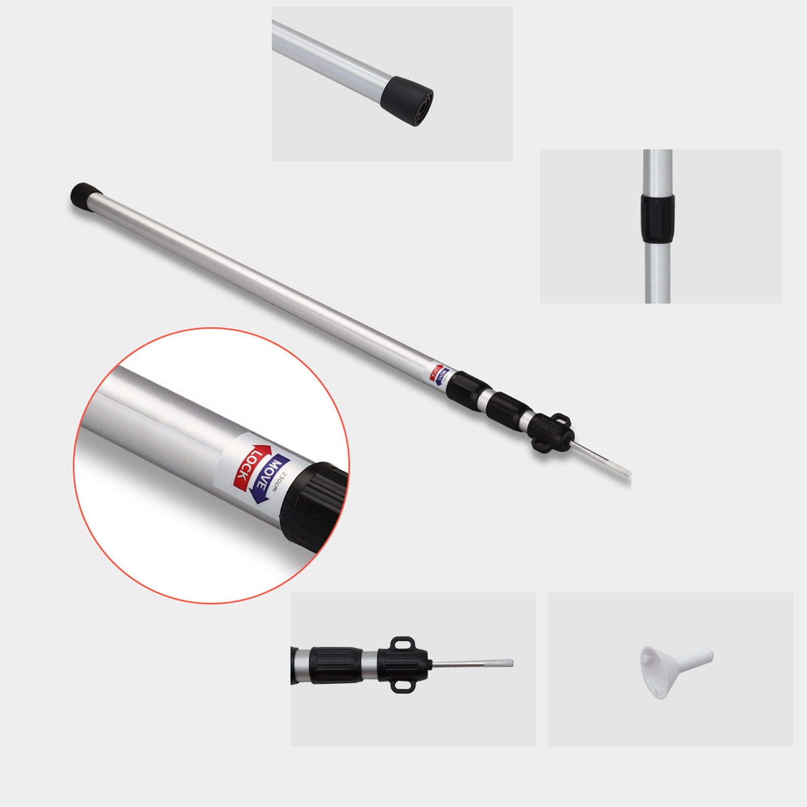 Регульований: 90-230 см (скорочення трьох розділів). Зовнішній 30 мм, 2 зовнішній діаметр 25 мм, 3 зовнішній діаметр 21 мм. Запропова довжина: найкоротший 0,9 м ~ найдовший 2,3 м. З дном, що не є слизом. RV, базові табори та табори пригод у джунглях. Розміщений на наметі або брезенту, ви можете насолоджуватися розвагами на відкритому повітрі.
