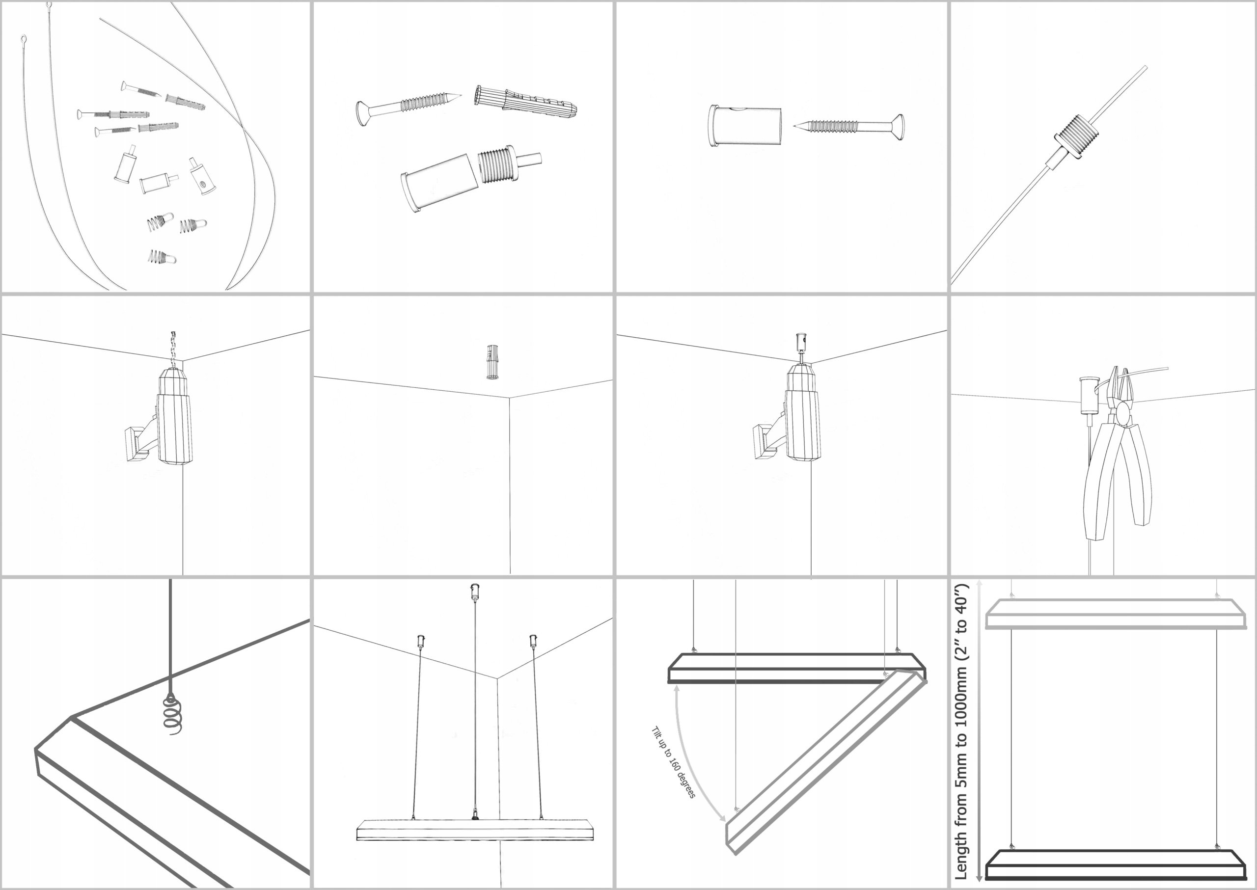 - Панель постачається зі спеціальною системою кріплення до стелі. До однієї панелі йде комплект із 3 кабелів. Довжина кабелю становить 1 метр (40 дюймів).