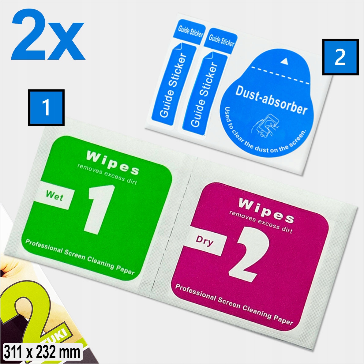 1️⃣ Дві тканини: волога та суха. Використовуйте їх, щоб ідеально очистити екран перед встановленням фольги.