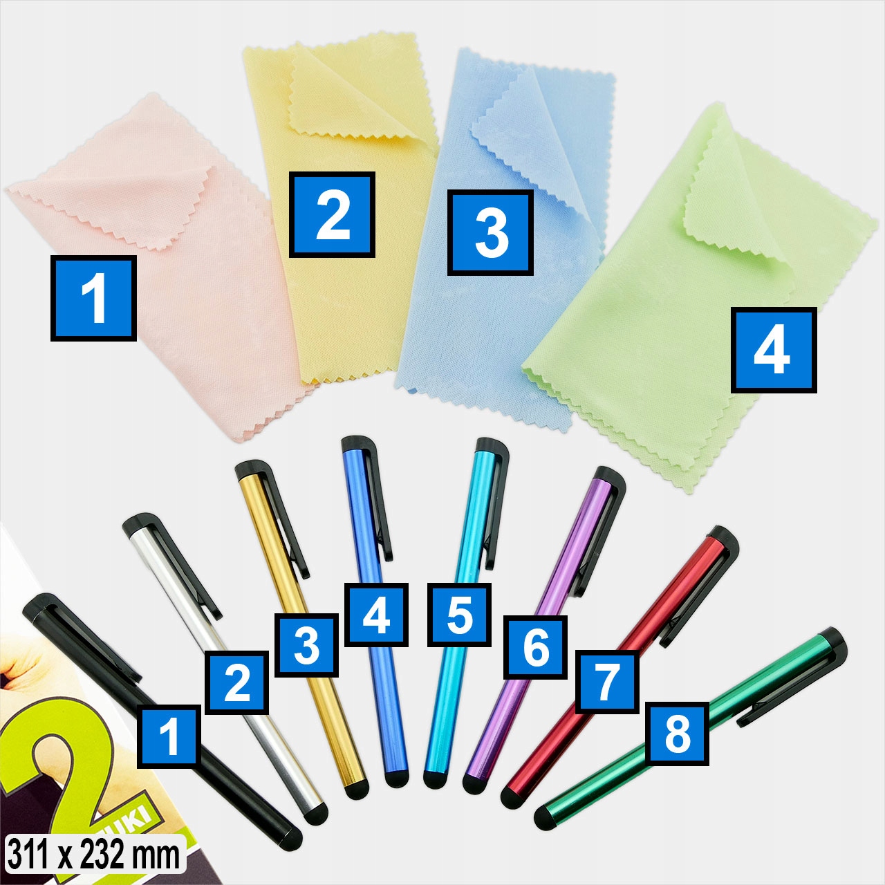 Кольори подарунків вибираються випадково. Однак, якщо вам дуже важливий конкретний колір, напишіть у коментарях до замовлення, який колір ви бажаєте для тканини та стилуса, і ми постараємося їх надіслати.