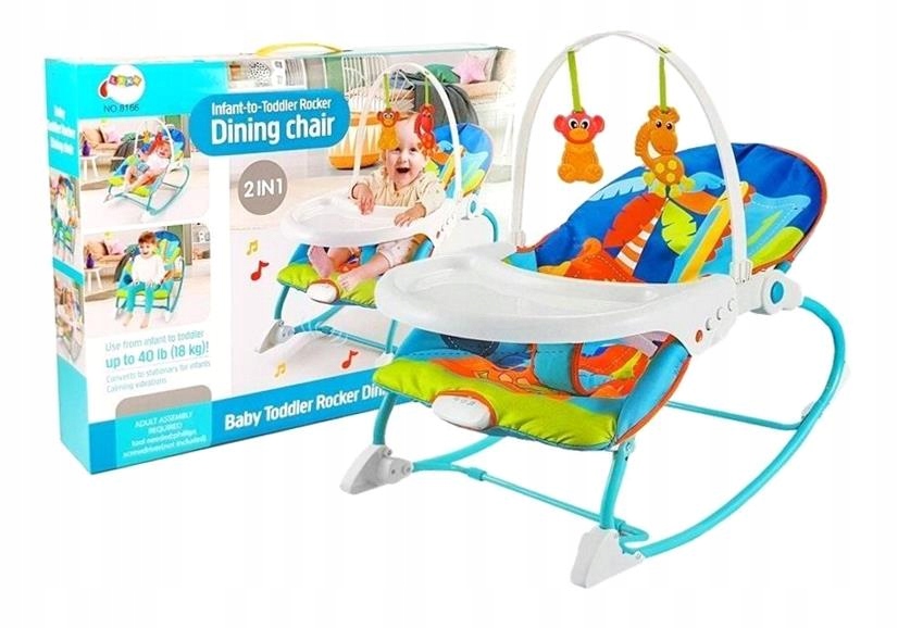 Cradle Rocker Seat Feeding Chair 2 in 1 Blue Комфортне сидіння, в якому малюк може відпочити та пограти, дуже важливе при складанні лежака для дитини. Ми представляємо синьо-зелену качалку, прикрашену мотивом динозавра, яка, безсумнівно, принесе велике задоволення кожній дитині. Він був розроблений з урахуванням новонароджених і дітей старшого віку. Можна використовувати дітям до 3 років. Максимальне навантаження до 18 кг. Завдяки інтуїтивно зрозумілому керуванню та, перш за все, простому дизайну, шезлонг можна використовувати різними способами. Ви з успіхом можете використовувати його як крісло-качалку для малюка, а також класичний стільчик для годування, який можна розкласти в будь-яких умовах. Багатофункціональність дитячого сидіння означає, що ви можете брати його з собою всюди та змінювати його використання залежно від ситуації. Це крісло росте разом з вашою дитиною! Коли ваша дитина підросте, просто зніміть ремені безпеки. Має наступні функції: - сидіння відкидається в 4 положеннях - тканину можна прати в пральній машині - столик для прийому їжі - заспокоює вібрацію, полегшуючи засинання - глибоке сидіння - 3-х точковий ремінь безпеки - знімне коло з іграшками Додатково набір містить плюшевого ведмедика та жирафа для підвішування. Вони неодмінно привернуть увагу вашої дитини, спонукаючи її тренувати руки. Качалка може стимулювати або заспокоювати почуття дитини завдяки вібрації. Розміри стільця: 72 см х 49 см х 35 см Розміри сидіння: довжина - 70 см ширина - 40 см глибина сидіння - 10 см Розміри підвісних іграшок: прибл см. Довжина кола: 86, 5 см. Розміри столика: 41 см х 36 см. Розміри упаковки: 58 см х 44 см х 10,5 см. Качалка живиться від 2 батарейок АА 1,5 В, які не є включені в набір. Призначений для дітей з перших днів життя. Відповідає стандарту EN71. Іграшка виготовлена із сертифікованого матеріалу – пластику, стійкого до частого використання.