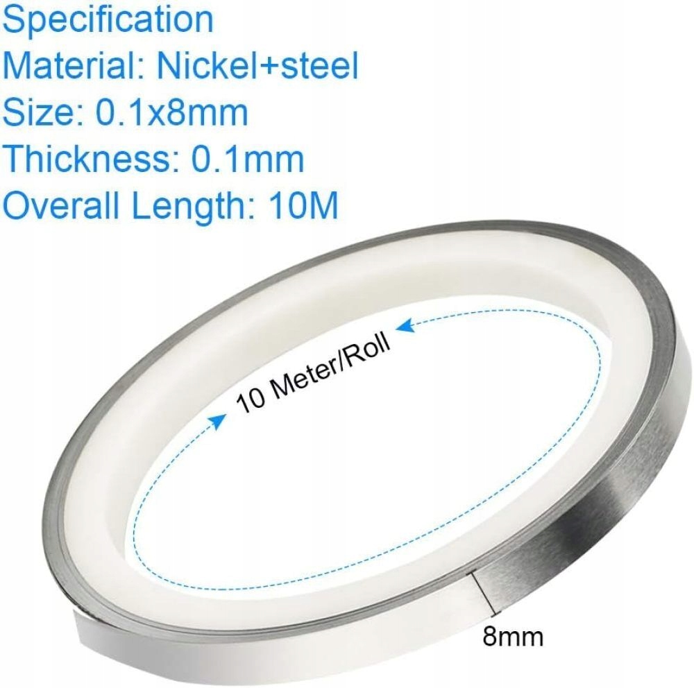 【2 рулони 10-метрової нікелевої стрічки】 У наш пакет продукту входять 2 рулони роз’єму акумулятора, специфікація виробу 0,1*8 мм і довжина 10 м. .Достатньо, щоб задовольнити ваші щоденні потреби та промислові потреби. Його можна використовувати для зменшення опору електропровідності та покращення антикорозійної здатності. Це хороший вибір для щоденного використання.