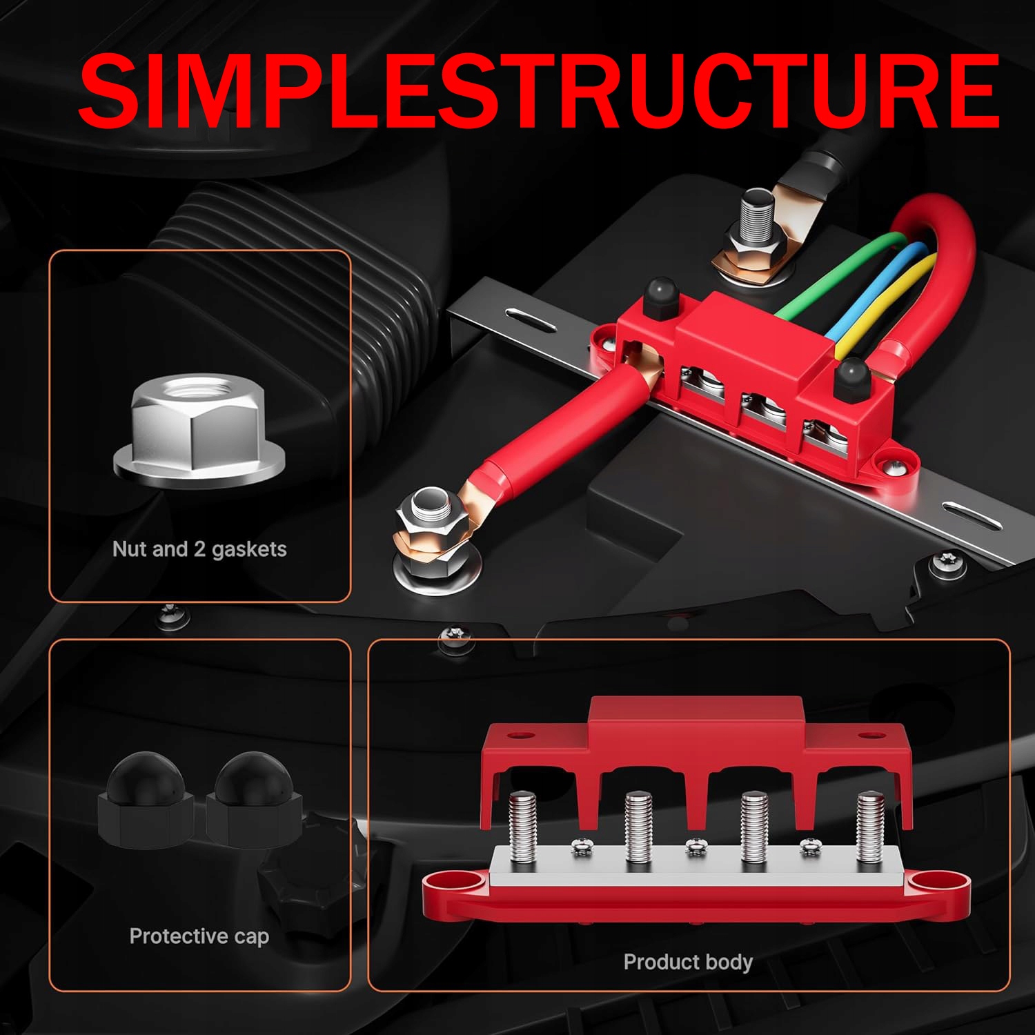 Удосконалена конструкція - мідні пластини тримаються на місці великими гвинтами замість невеликих гвинтів, колективна рейка та основа можуть витримувати великий крутний момент, вся збірна рейка є більш стійкою, а колективна рейка не струне, коли розгортає гайку. Невеликий гвинт зосереджений, проводка зручніша для здійснення збоку, проводка також може бути розміщена ступінчастим способом відносно інших проводів високого струму. Специфікація - 12-48 В червона та чорна колективна рейка з гвинтом: 3 x затискачі гвинта №8 (M4), 4 x 3/8 "(M10) затискача дюбеля. Розміри (довжина * Ширина * висота): 17 * 7 * 5 см. Усі клеми наших колективних рейок - це сталі, що є менш сприйнятливим до іржі порівняно з іншими колективними залізами.