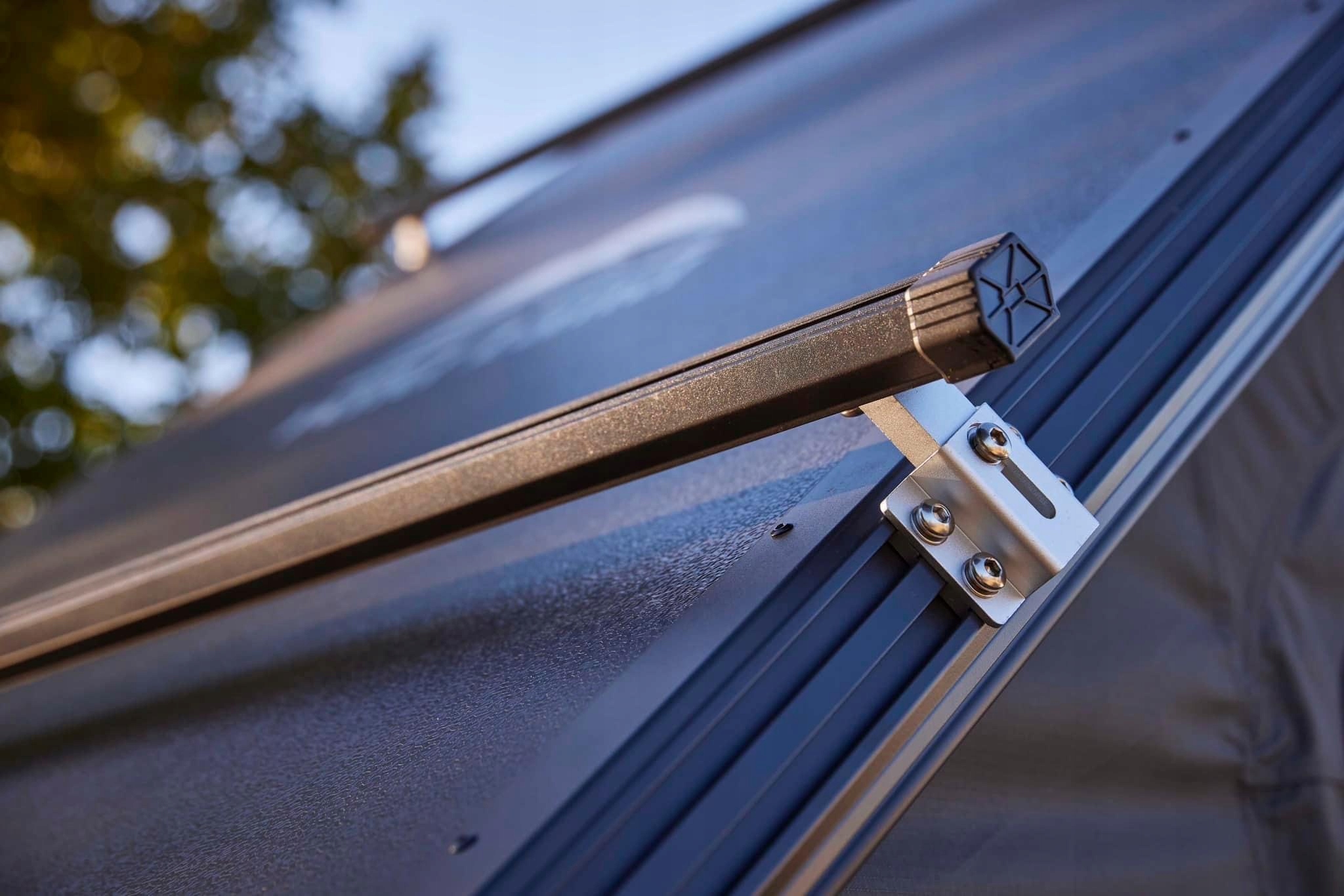 Основа намету має вбудовані рейки, до яких кріпляться пряжки для кріплення намету до стовбур. на даху автомобіля.