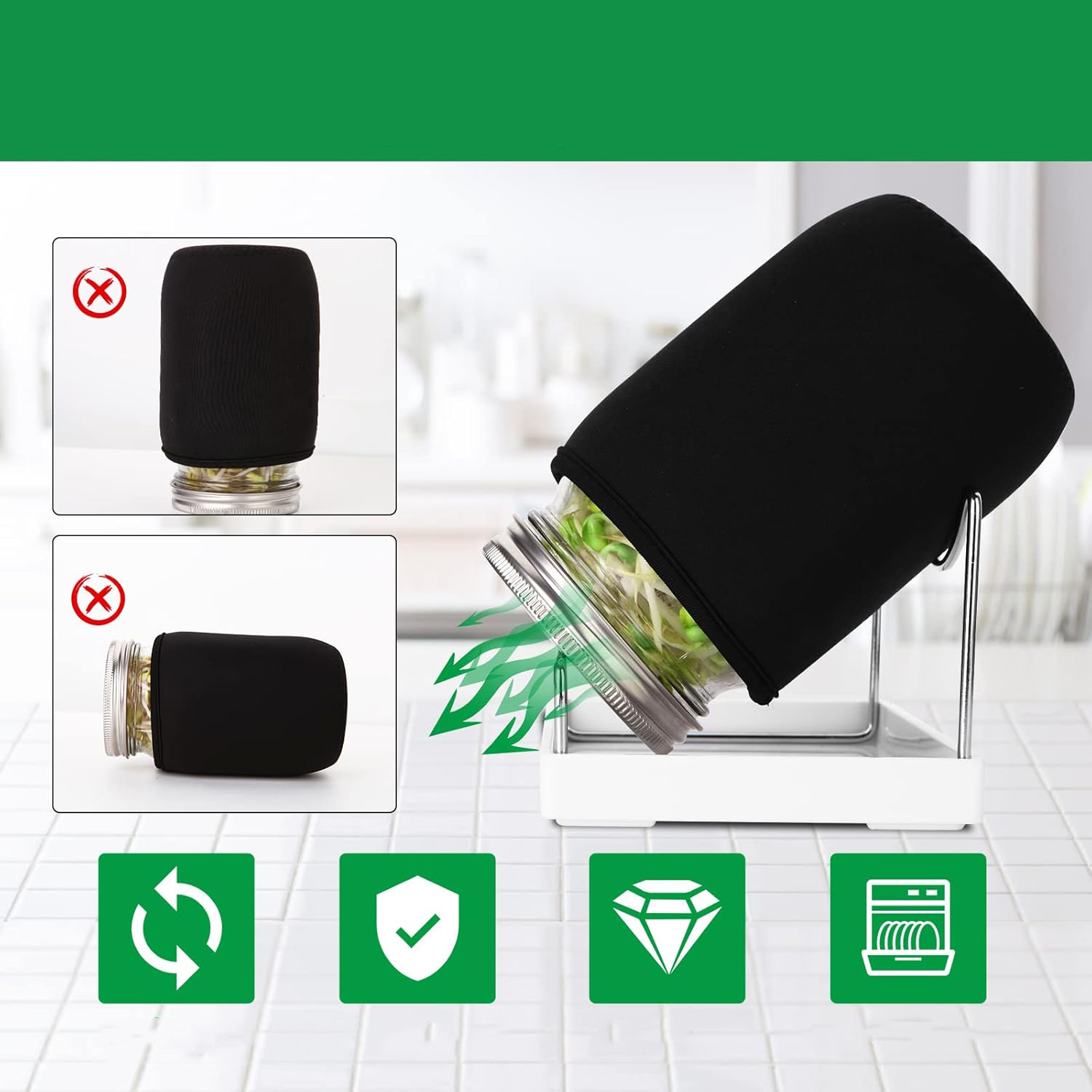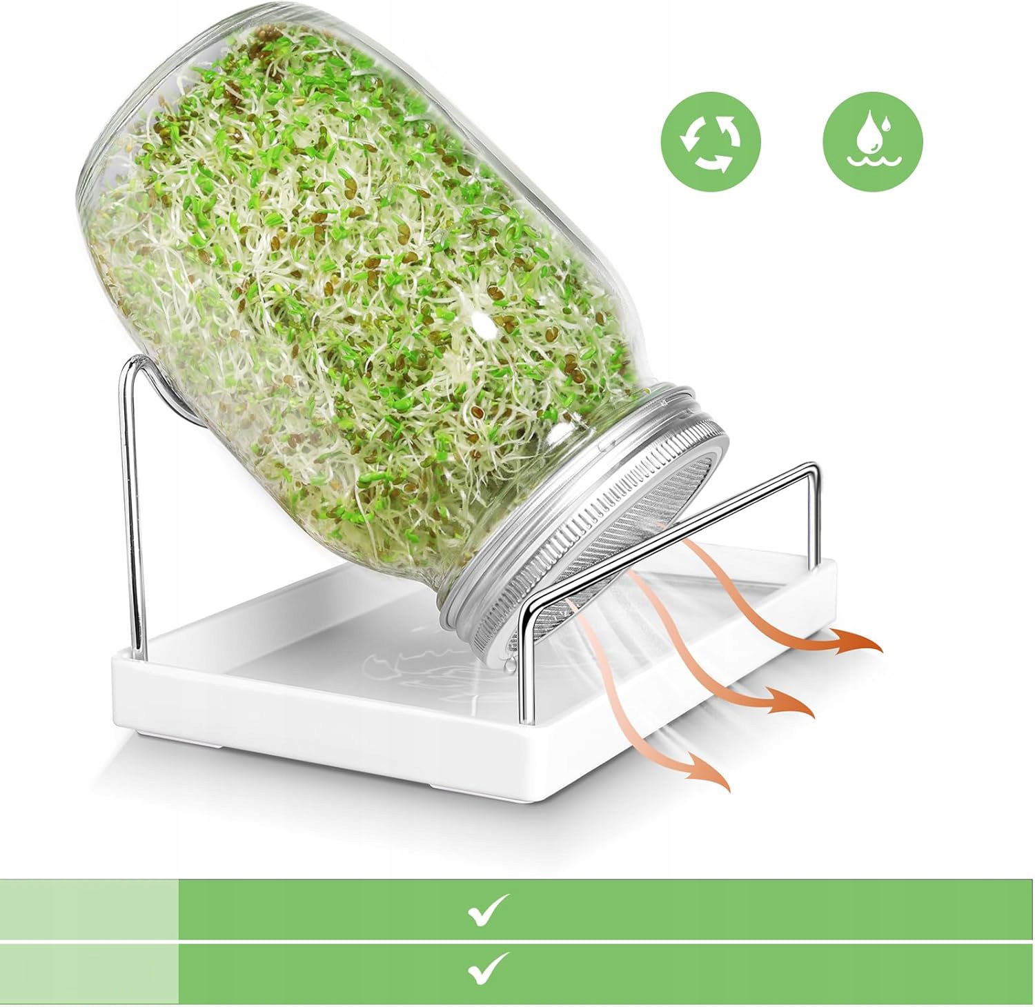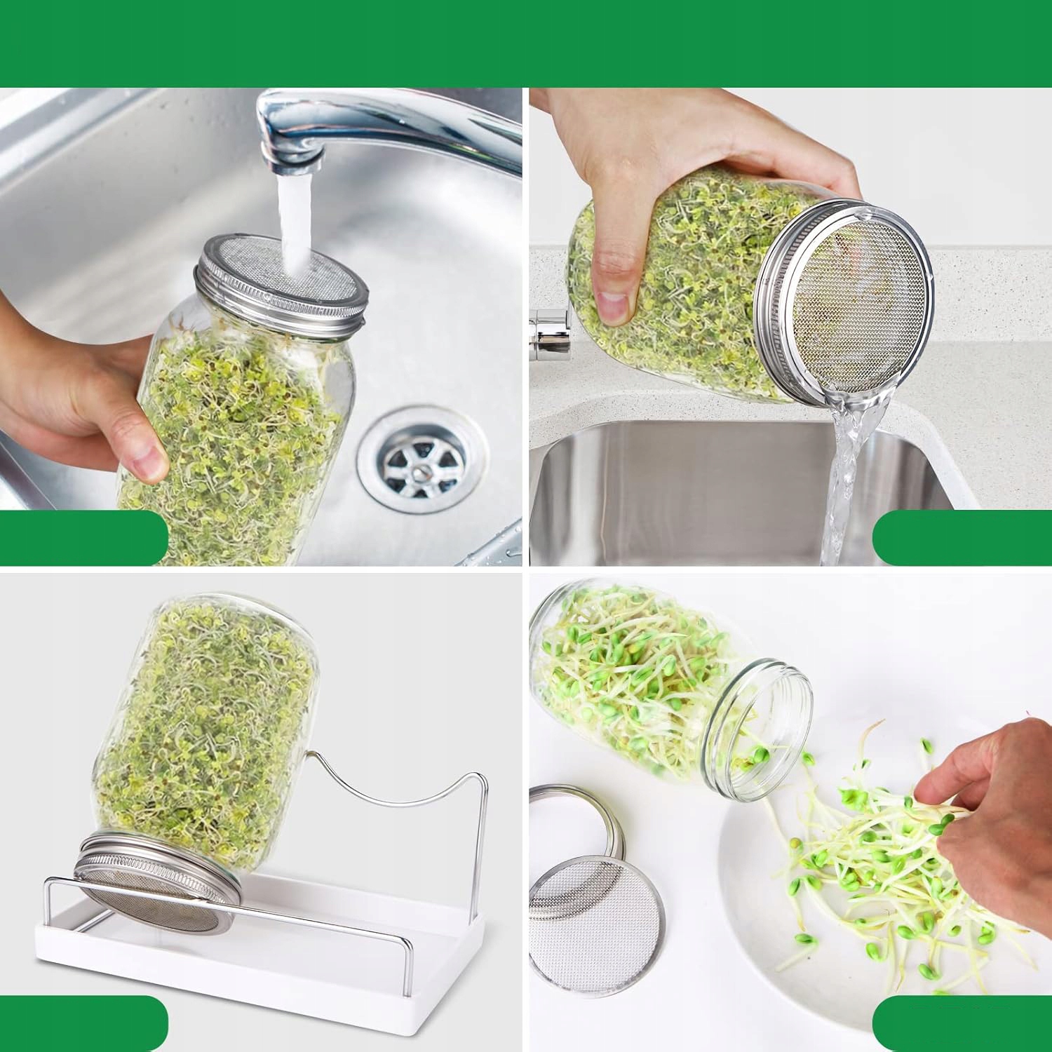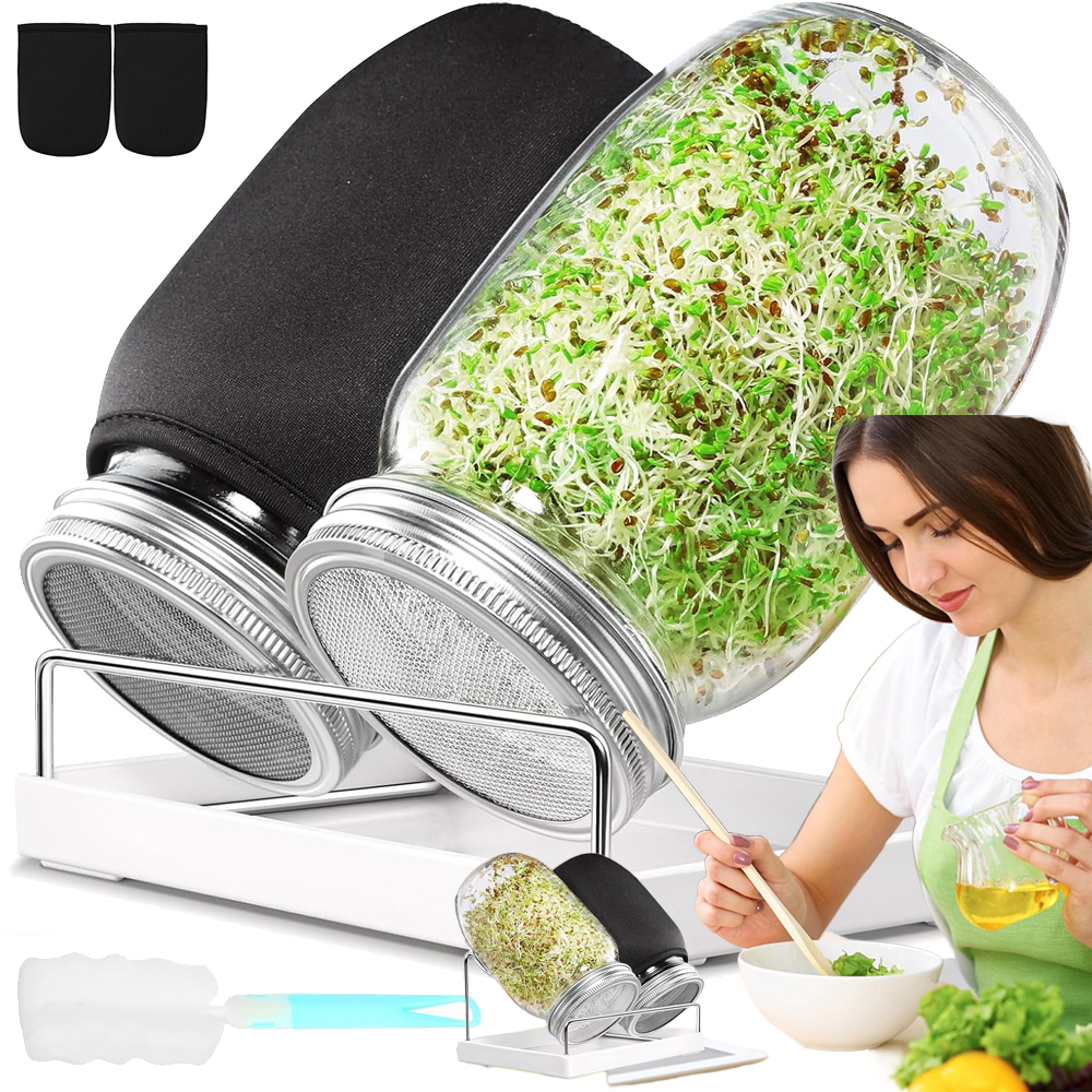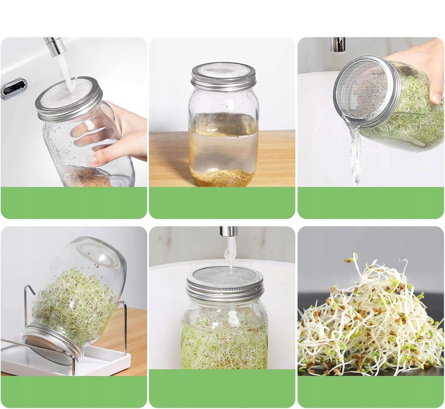 🌱 Набір включає всі аксесуари, необхідні для вирощування паростків. Набір включає 2 затінені кришки тканини, 2 скляні банки, 2 кришки з нержавіючої сталі, 1 лоток та 1 підставка (насіння не включені).