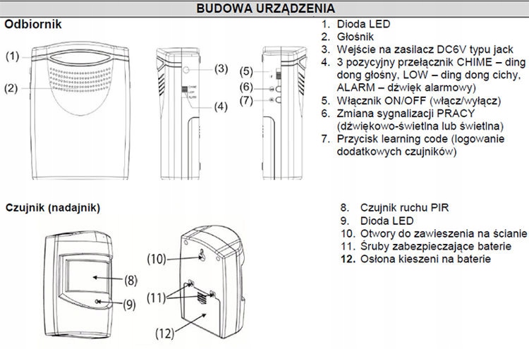Пристрій дозволяє контролювати вхідні двері, які знаходяться в іншому приміщенні або будівлі. PIR-датчик руху, реагуючи на зміну температури в зоні виявлення, бездротовим способом (за допомогою радіохвиль) посилає імпульс на приймач, який сповіщає звуковим сигналом (дінь-дон, дінь-дон без звуку або тривога) і світловим сигналом ( LED діоди) про виявлення руху в охоронюваній зоні. Ступінь захисту IP44 дозволяє встановлювати датчик на вулиці та в приміщеннях з підвищеною вологістю.