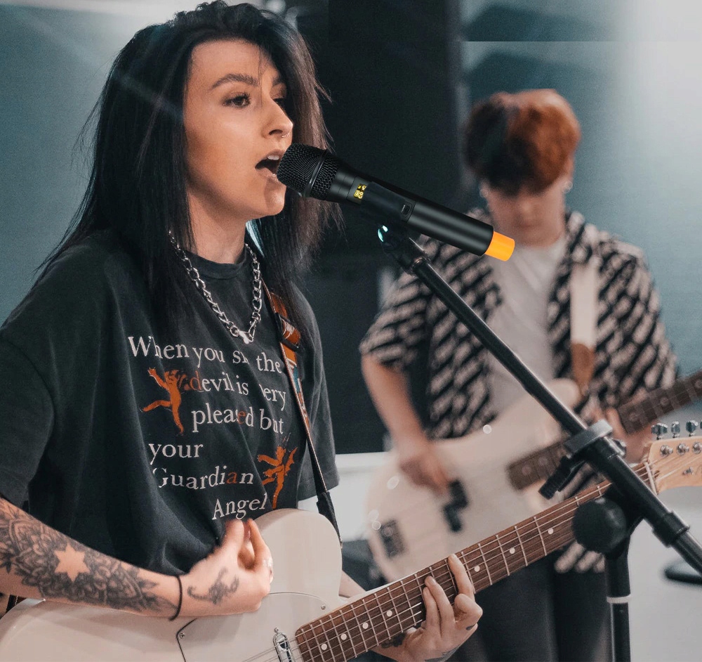 - Якість сценічного звуку: високоякісна передача звуку, чистий голос без зворотного зв’язку та спотворень. Цей портативний бездротовий мікрофон призначений для використання вокалу під час живих виступів, підсилення звуку та студійного запису.