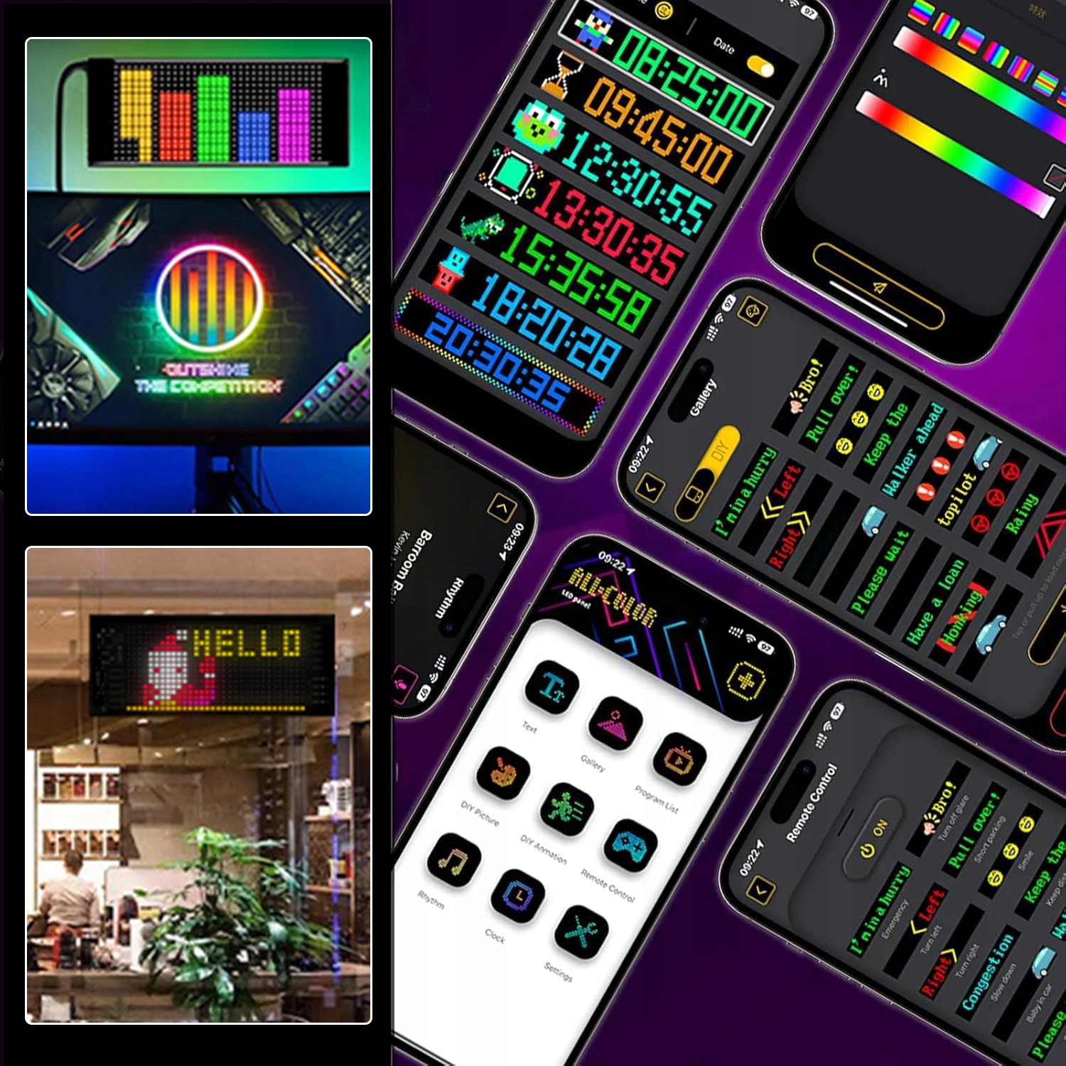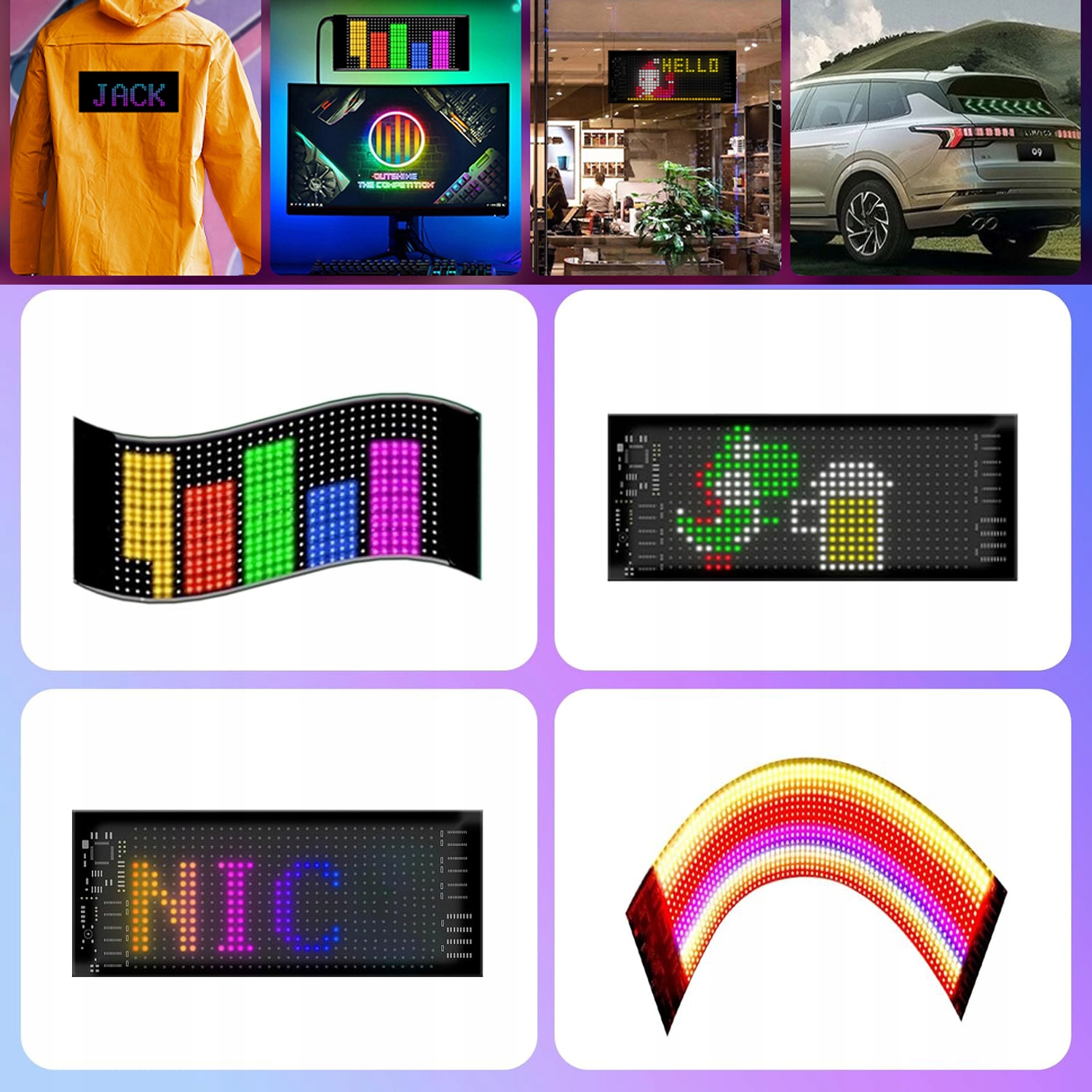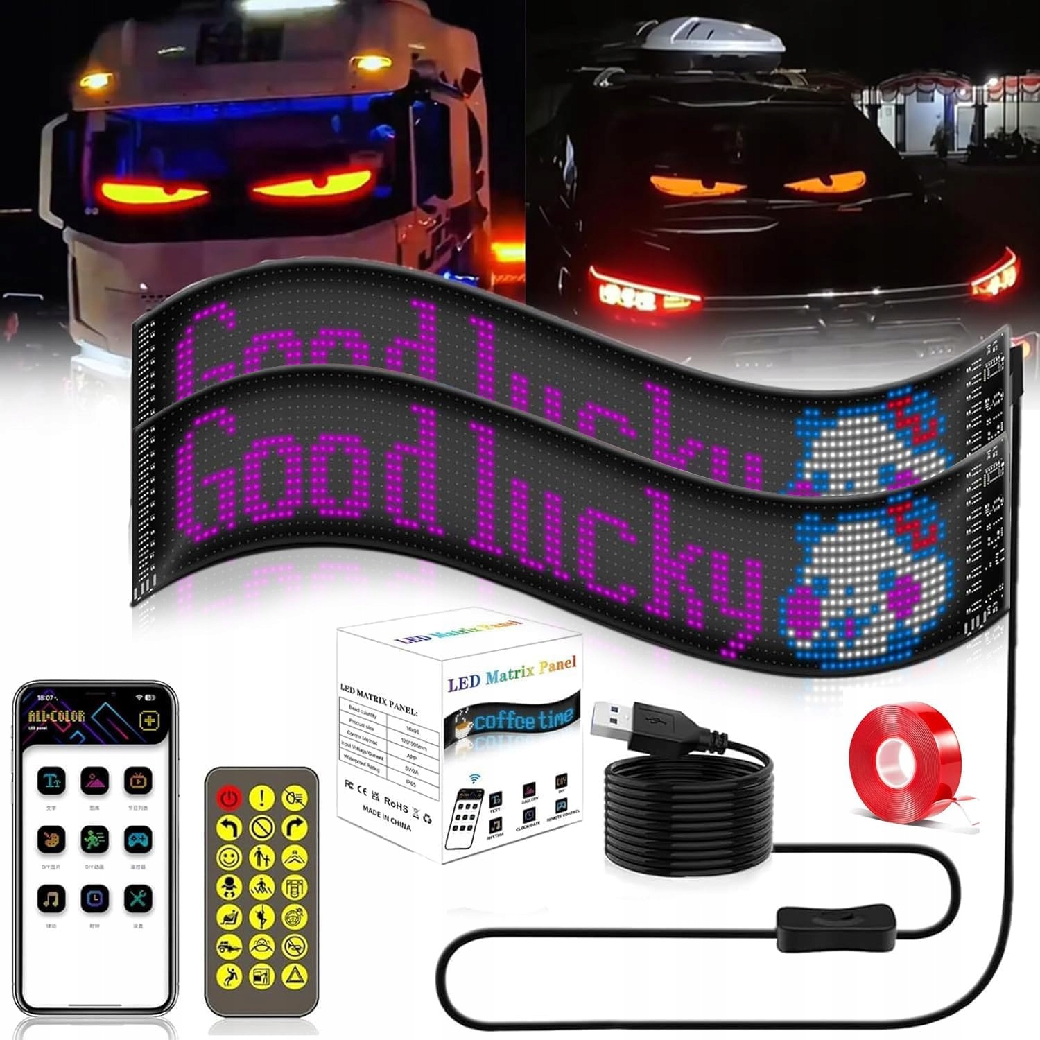 ✨ ✨ Це стосується різних сценаріїв: динамічний, програмований, гнучкий світлодіодний дисплей для самостійного складання в автомобілях може використовуватися в барах, ресторанах, магазинах, автомобілях, продавцях вулиць, на заходах, концертах, весільних прикрасах і не тільки. Зробіть очі на очах, що відповідає автомобілю, встановивши ультра -високо -код -світлодіодний BT.