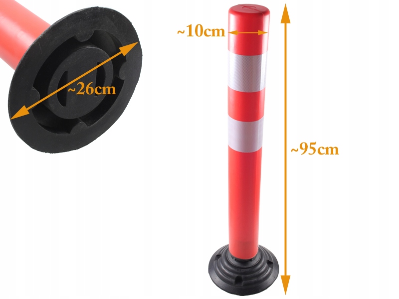 Відкидна стійка 95 см з червоного пластику. Для покращення видимості вночі або в умовах обмеженого освітлення в підземному паркінгу також використовуються світловідбиваючі смуги. Завдяки гнучкому механізму болард повертається у своє вертикальне положення після удару.