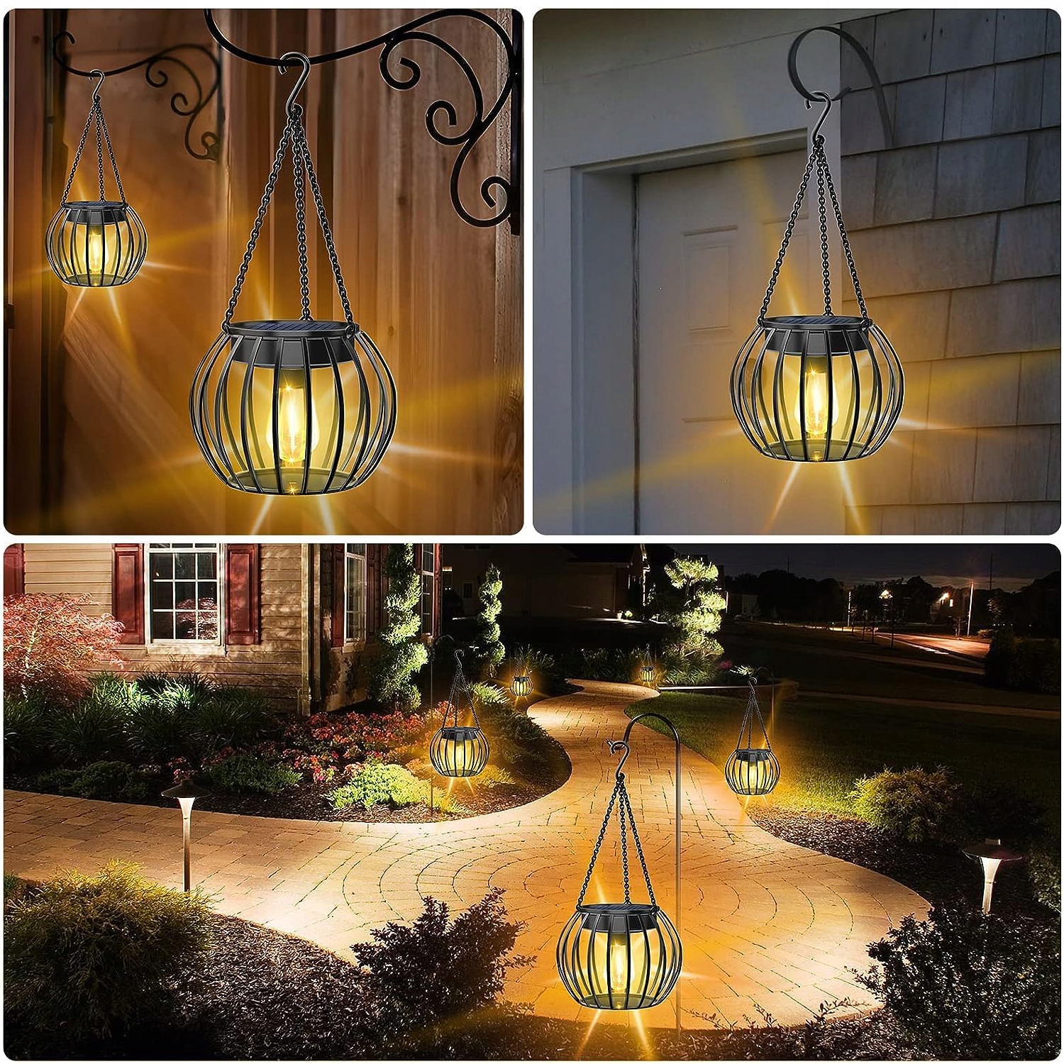 - 🌟 【Унікальний дизайн】: зовнішні сонячні ліхтарі виготовлені з високоякісних гачків і ланцюгів, а також міцних з’єднаних плоских залізних прутів. Круглі вуличні ліхтарі привнесуть теплі кольори у ваш сад. Лампи на сонячних батареях - ідеальне доповнення до вашого саду. 🌟 【Яскраве сонячне світло】: вуличні сонячні ліхтарі можна використовувати надворі цілий рік, підвішуючи їх до пастуших гачків, дерев і ґанків або розміщуючи на скатертинах, сходах і балконах, щоб випромінювати м’яке світло вночі.
