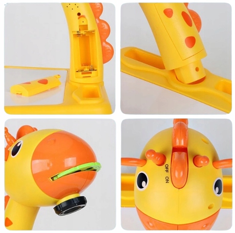 Користуватися проектором просто та інтуїтивно зрозуміло, тому дитина може повністю присвятити себе малюванню картинок. Перед використанням проектора спочатку вставте 3 батарейки типу АА 1,5 В. Потім просто встановіть ноги та шию жирафа у відповідних місцях.