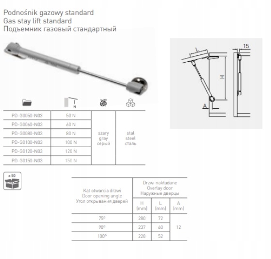 Газліфт GTV PD-G0060-N02 для меблевих фасадів. Дозволяє легко та безшумно піднімати передню частину. Для рівномірного підйому рекомендується встановити 2 підйомника з обох сторін передньої частини. Газова стійка проста в установці та має універсальні передні кріплення. Фронт може відкриватися на кут 75° - 100° залежно від використовуваних петель.