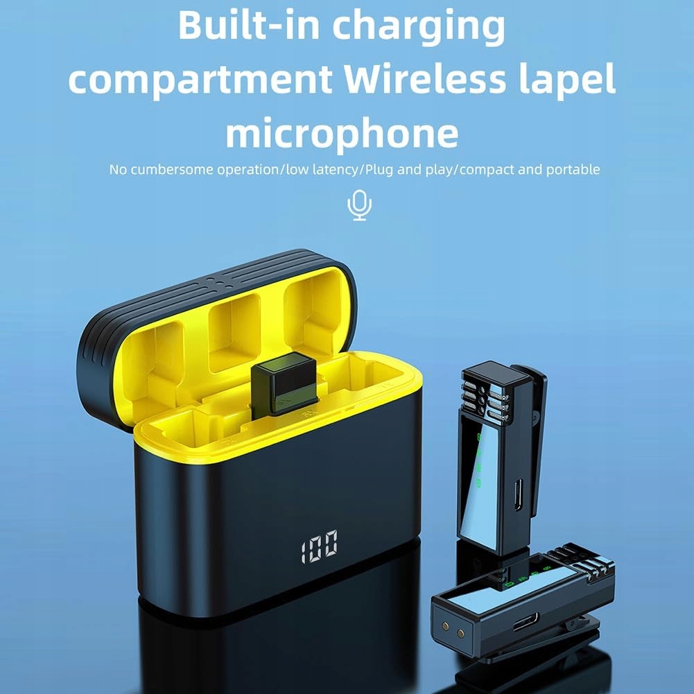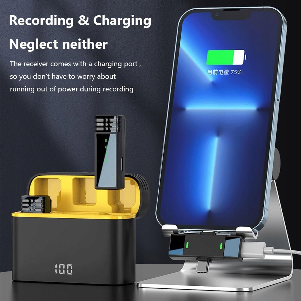 Довготривале живлення: петличний мікрофон забезпечує триваліші сеанси запису завдяки вбудованому акумулятору на 80 мАг, який забезпечує 6-8 годин використання. Зарядний футляр ємністю 600 мАг забезпечує додаткові 48-50 годин автономної роботи, гарантуючи, що мікрофон завжди буде готовий до інтерв’ю на відкритому повітрі чи прямих трансляцій, а також забезпечує зручне заряджання під час використання.