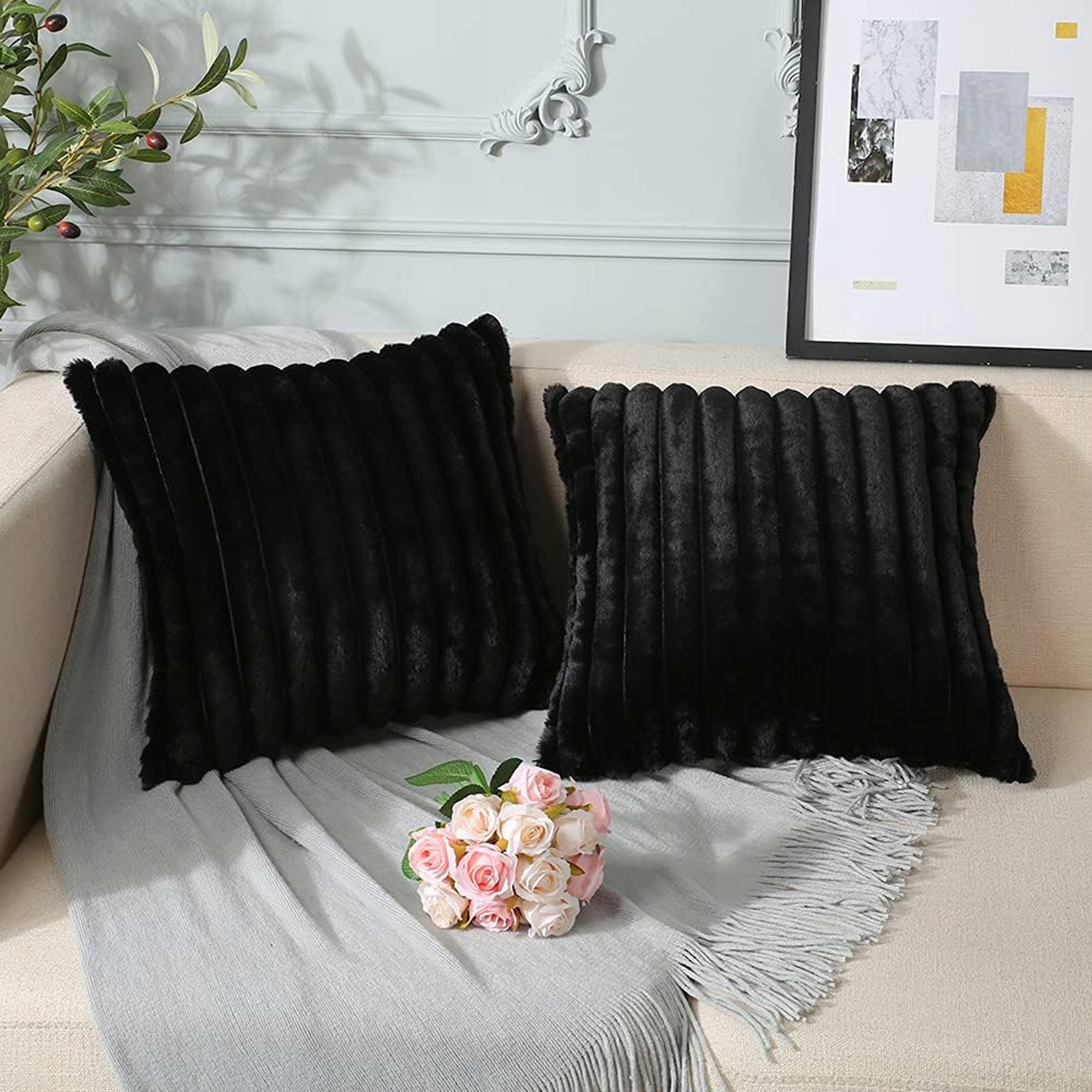 2X ПУХНАСТІ ДЕКОРАТИВНІ НАВОЛОЧКИ ДЛЯ СПАЛЬНІ 50X50СМ ЧОРНІ