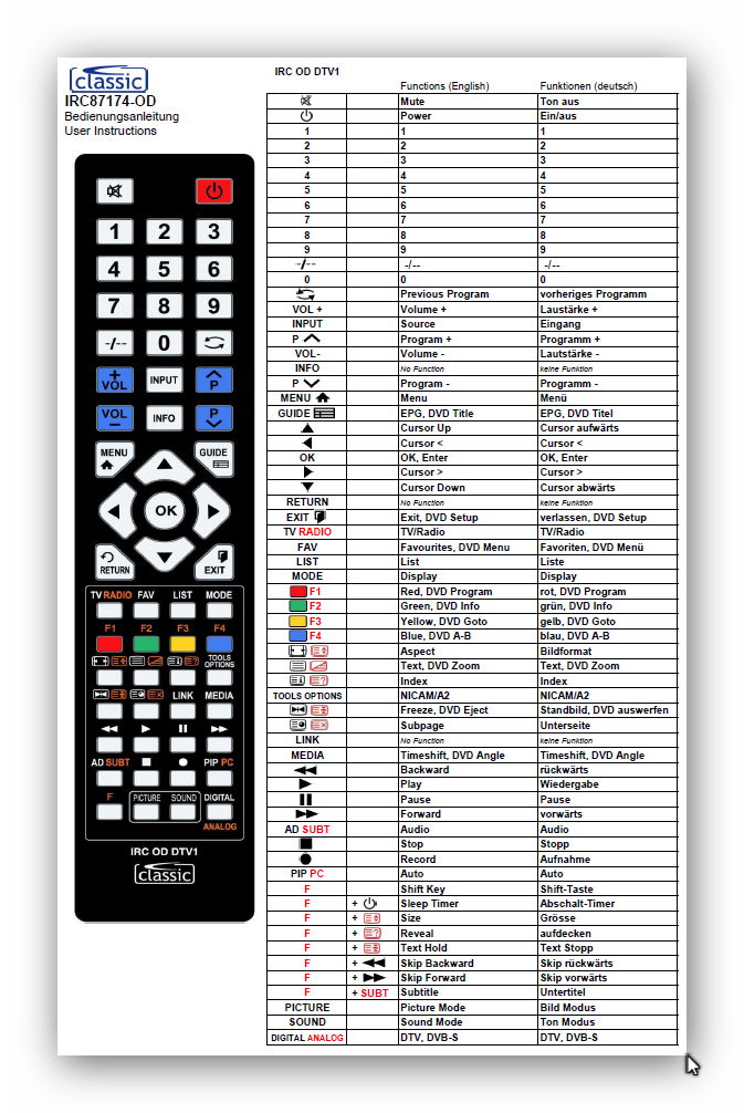 У пульт завантажені коди пульта IRC87174, який за даними виробника підходить до наступних приймачів: