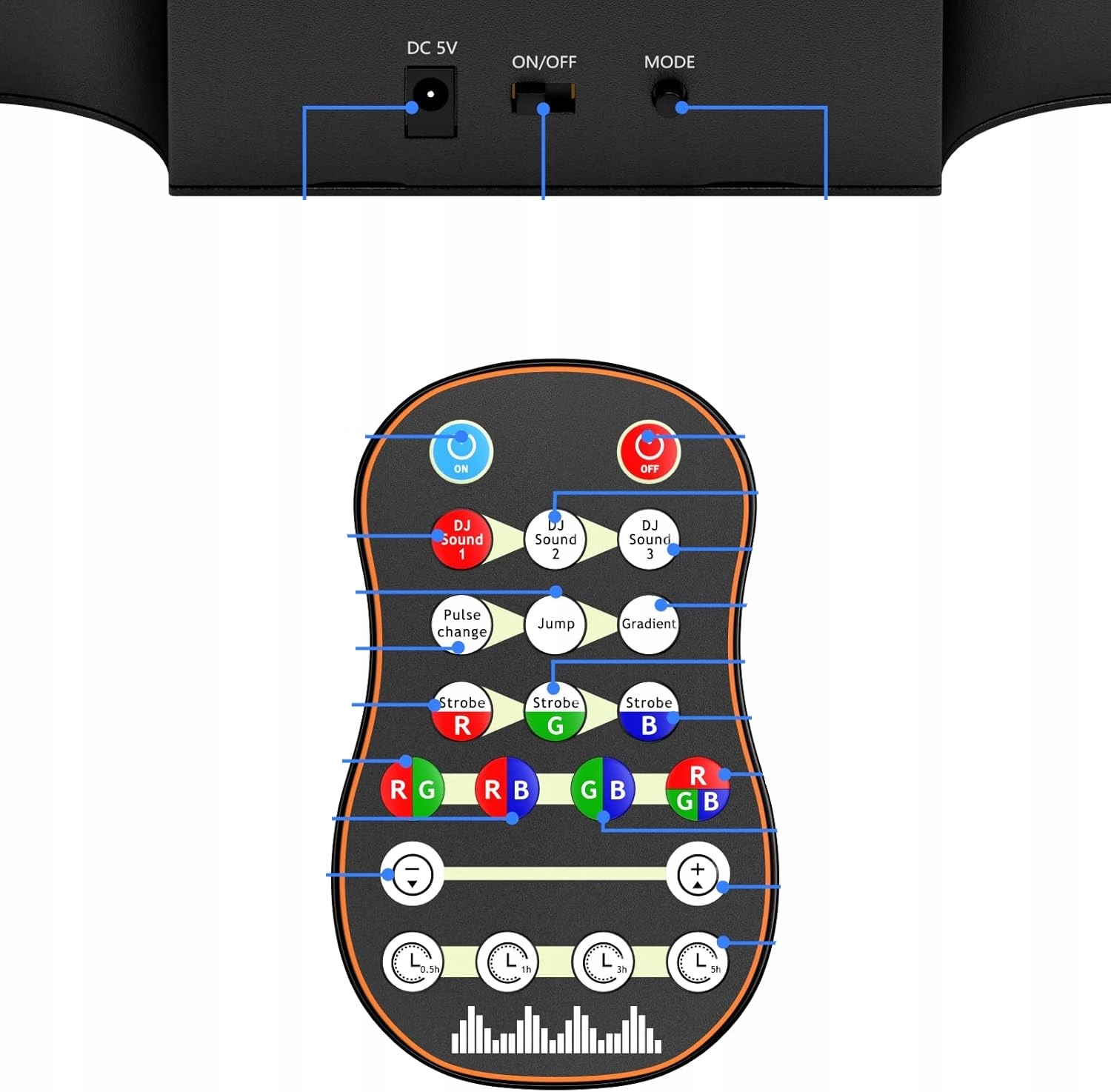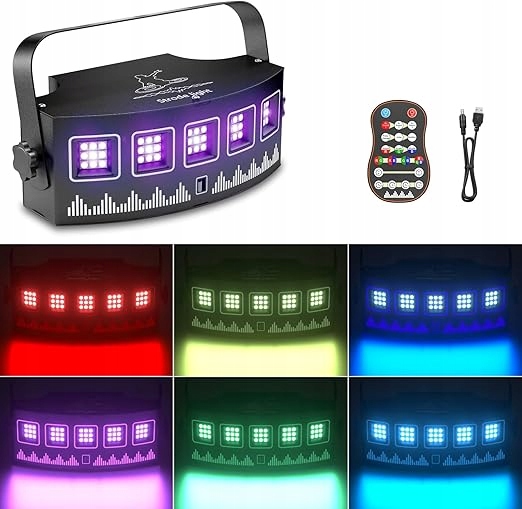 - Цей продукт має 5 точок освітлення, кожна з яких має 9 світлодіодів. Він має червоний, зелений, синій, жовтий, фіолетовий, блакитний і білий колірні режими. Режими роботи включають режим статичного кольору, стробоскоп, стрибок, активацію звуку, автоматичний цикл, режим таймера та режим дистанційного керування.