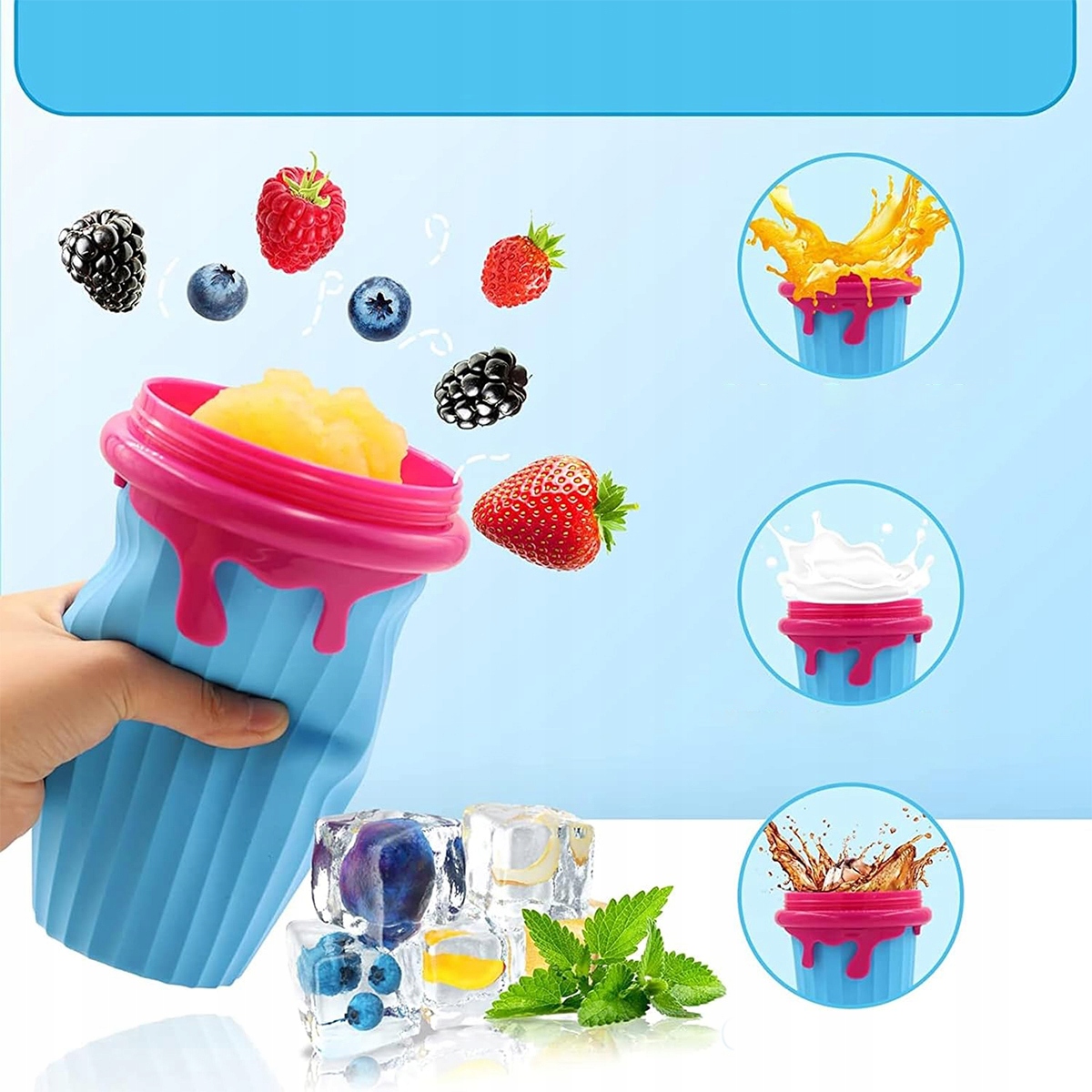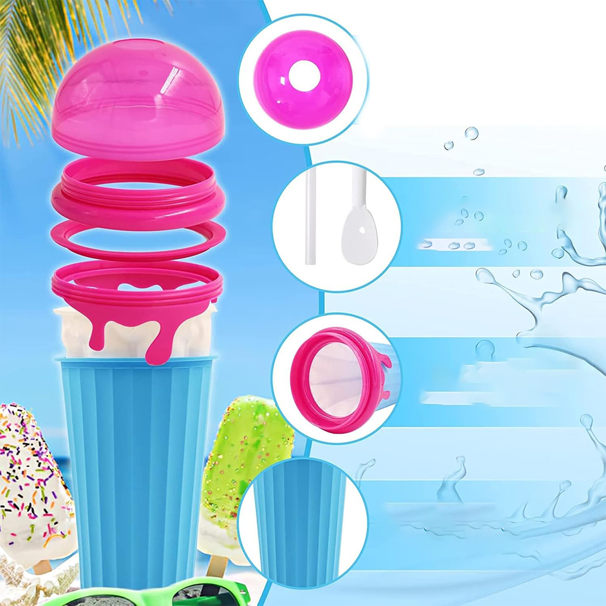 Діапазон доставки: Ви отримаєте 2 чашки для коктейлів (синій і коричневий), 2 столові ложки з соломою, 1 солом’яна щітка, 1 чистка кисті та 1 кольорова картонна упаковка. Влітку ви можете адаптувати смак морозива до своїх уподобань і створити власні творіння морозива, насолоджуючись усім процесом. Просто налийте улюблений напій і додайте інгредієнти, такі як фрукти, шоколад, горіхи та інші, щоб отримати додатковий смак та харчову цінність. Стисніть напій і насолоджуйтесь смачним подрібненим льоду прямо з машини для виготовлення подрібнених чашок для льоду.