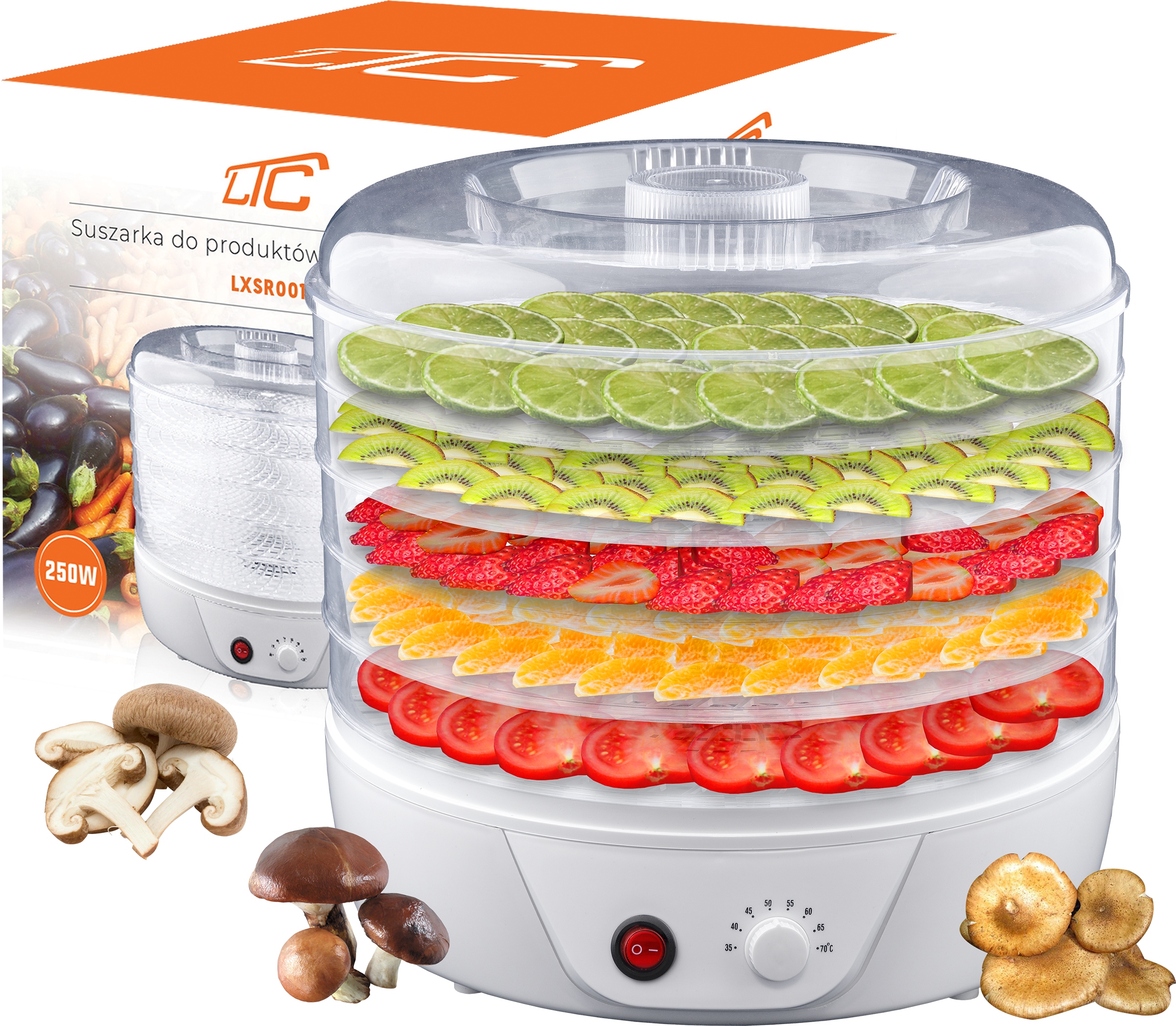 SR001 - це високоякісний пристрій від відомого бренду LTC, виготовлений з високоякісних матеріалів і з увагою до деталей. Це означає безвідмовність, довговічність і комфорт використання сушарки. Пристрій, корисний на кожній сучасній кухні. Використання інноваційної технології гарантує ідеальні параметри для процесу сушіння - стабільний потік повітря з ідеально налаштованою температурою.