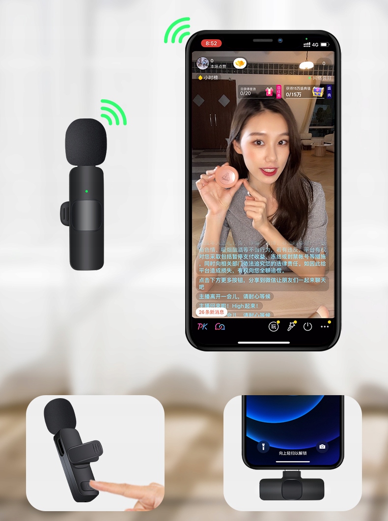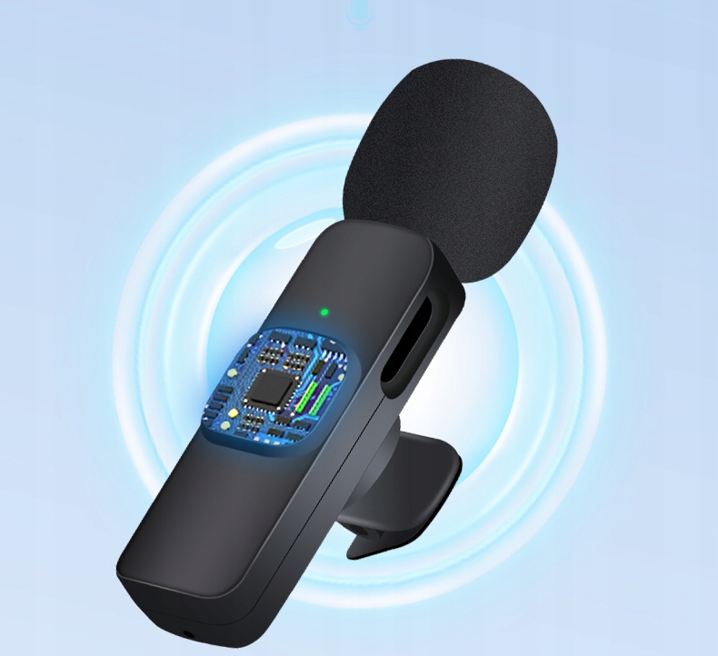 Пристрій оснащено невеликим мікрофоном, який забезпечує непомітну та зручну передачу звуку без необхідності тримати мікрофон у руках. Під’єднайте мікрофонний приймач до телефону/планшета/комп’ютера (роз’єм USB-C + адаптер Lightning).