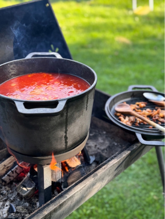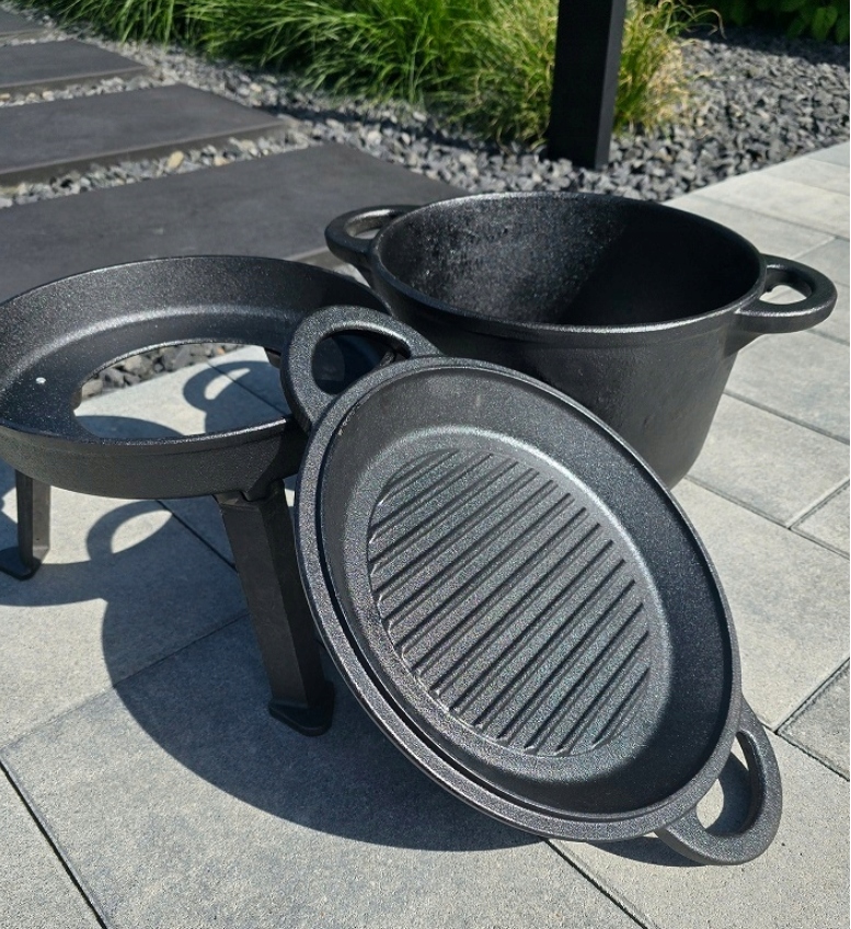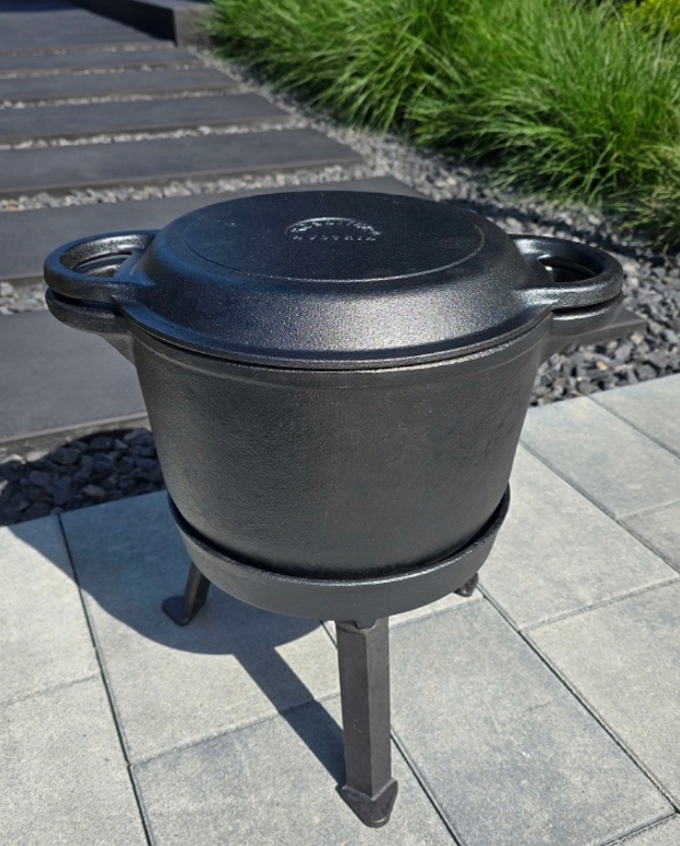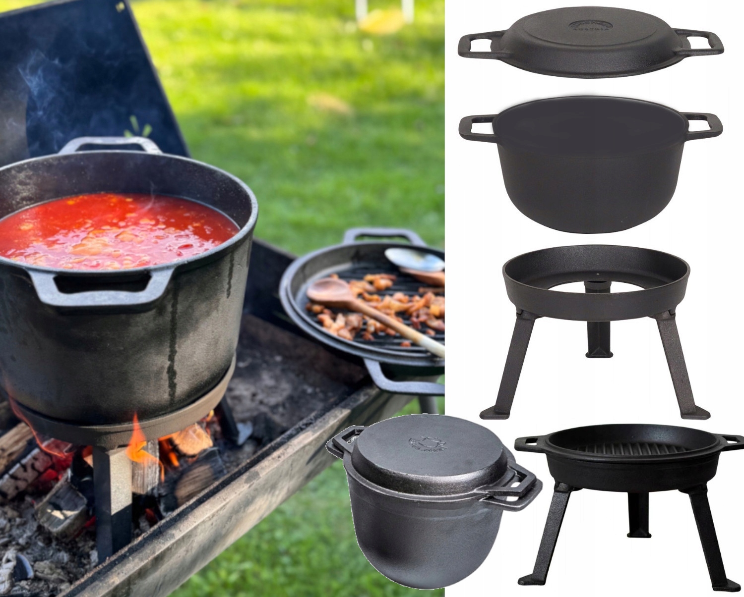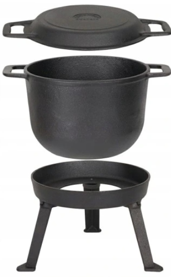 чавунний горщик (8 л) - основний елемент котла, ідеально підходить для приготування супів, рагу та інших одиничних страв. Він може бути зворотним і завдяки спеціальним канавам як гриль -сковороді, ідеально підходить для смаження та грилю м'яса, овочів або риби.