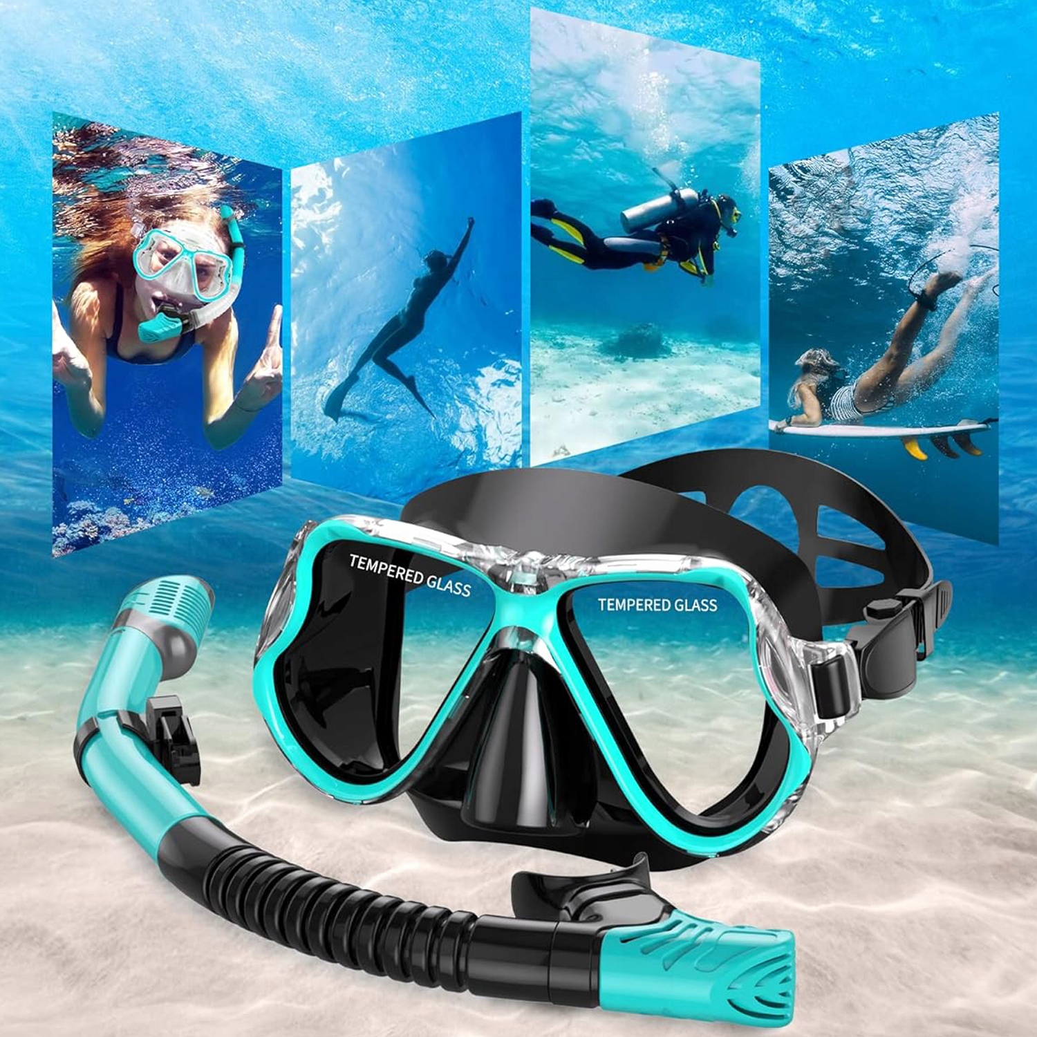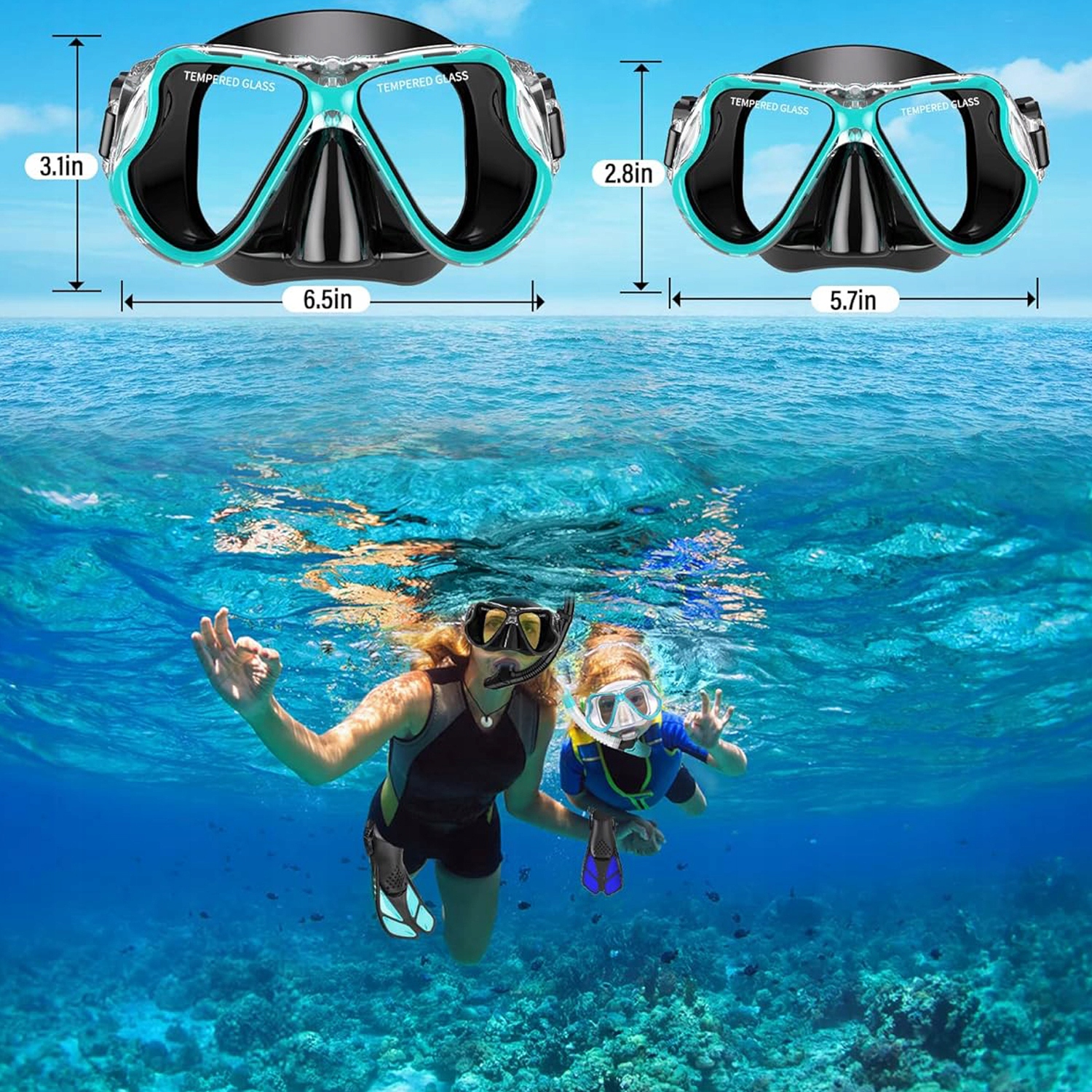 Маска для сноркелінгу має структуру з чотирма вікнами, загартованими скляними лінзами та низькою алергією силіконової спідниці, яка витримує тиск під водою під час дайвінгу та сноркелінгу, забезпечуючи найвищий комфорт. Спідниця для дайвінгу була розроблена з м'якого та гнучкого силікону, а силіконова маска їжі може створити водонепроникну ущільнювач з обличчям кожного водія, ідеально пристосовуючись до рота без запаху.