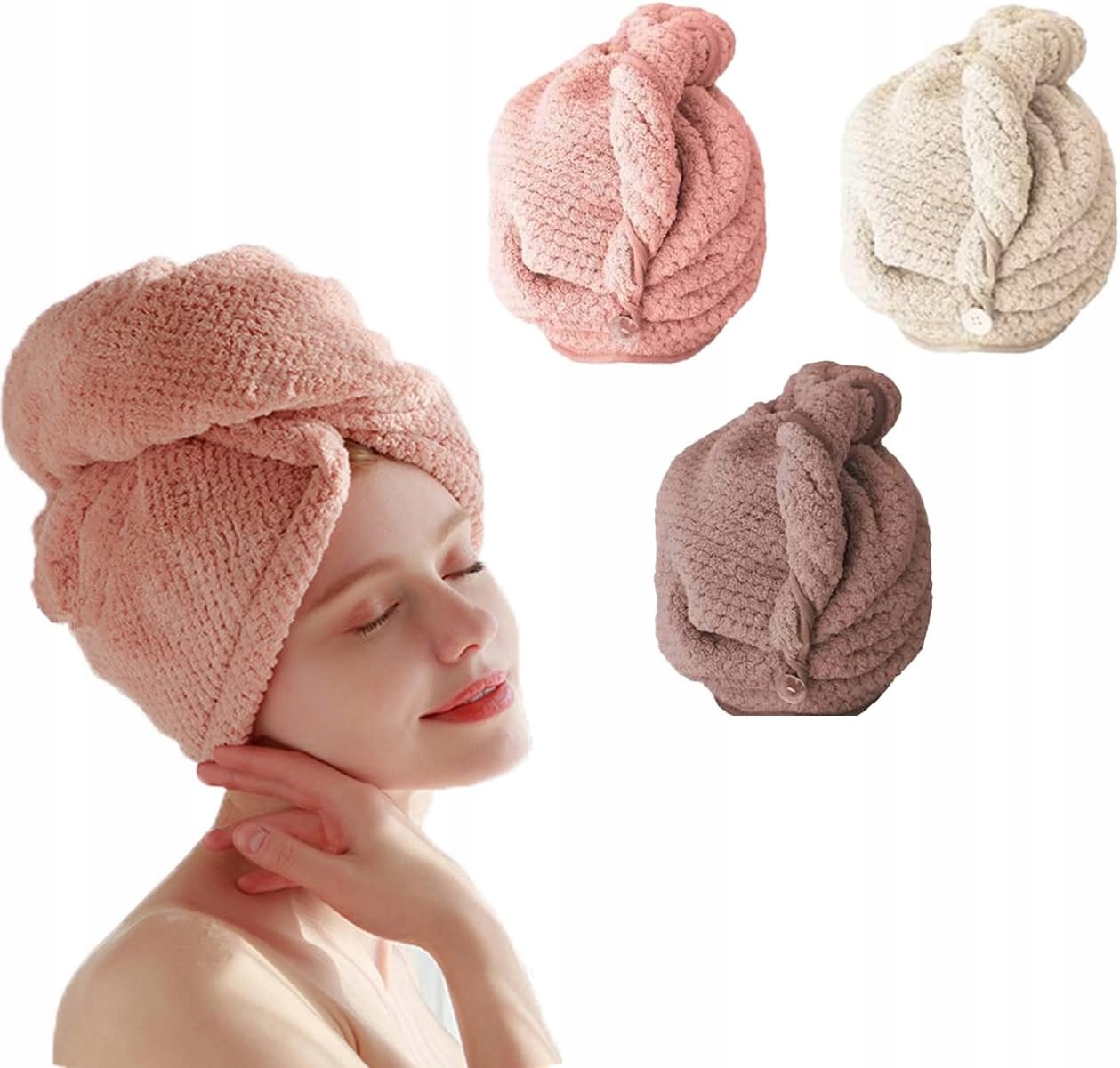 - 🔒 【безпека та стабільність】 - завдяки практичній кнопці та петлі тюрбан впевнено тримається на голові, не ковзаючи вниз. Відмінно підходить для нанесення макіяжу, використання масок для волосся або розслаблення при сушенні. 4 Захищає природну структуру волосся, забезпечуючи комфорт під час використання.
