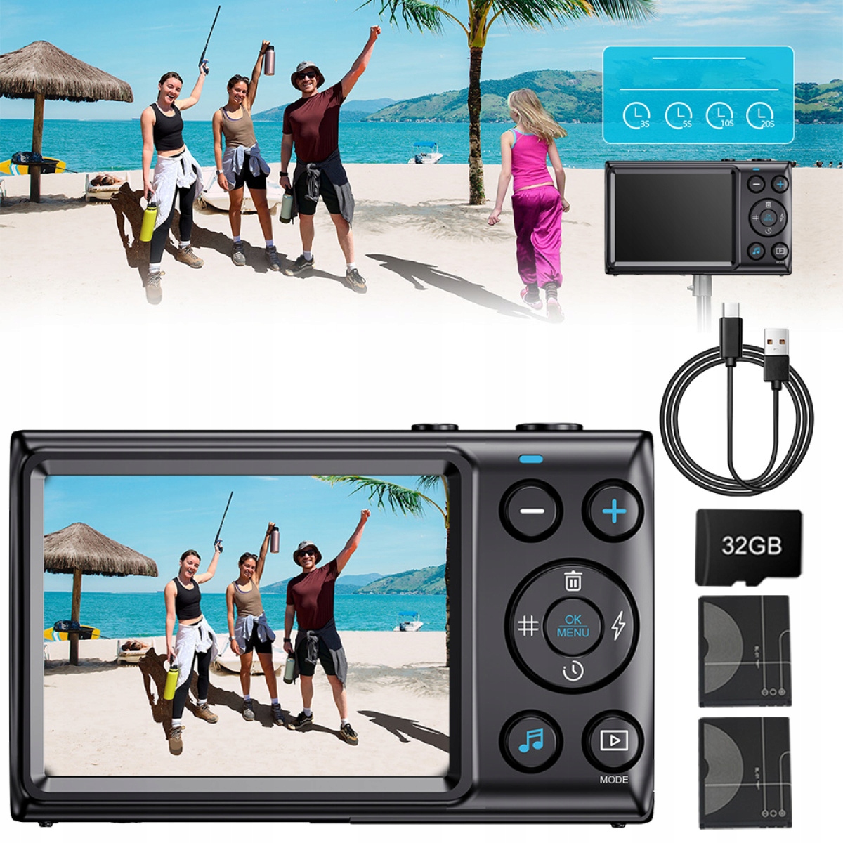 - ✅Кабель Type-C, що входить у комплект, і карта пам’яті на 32 ГБ дозволяють переносити фотографії та відео з камери на вашого комп’ютера.< /li>