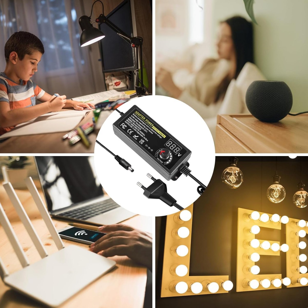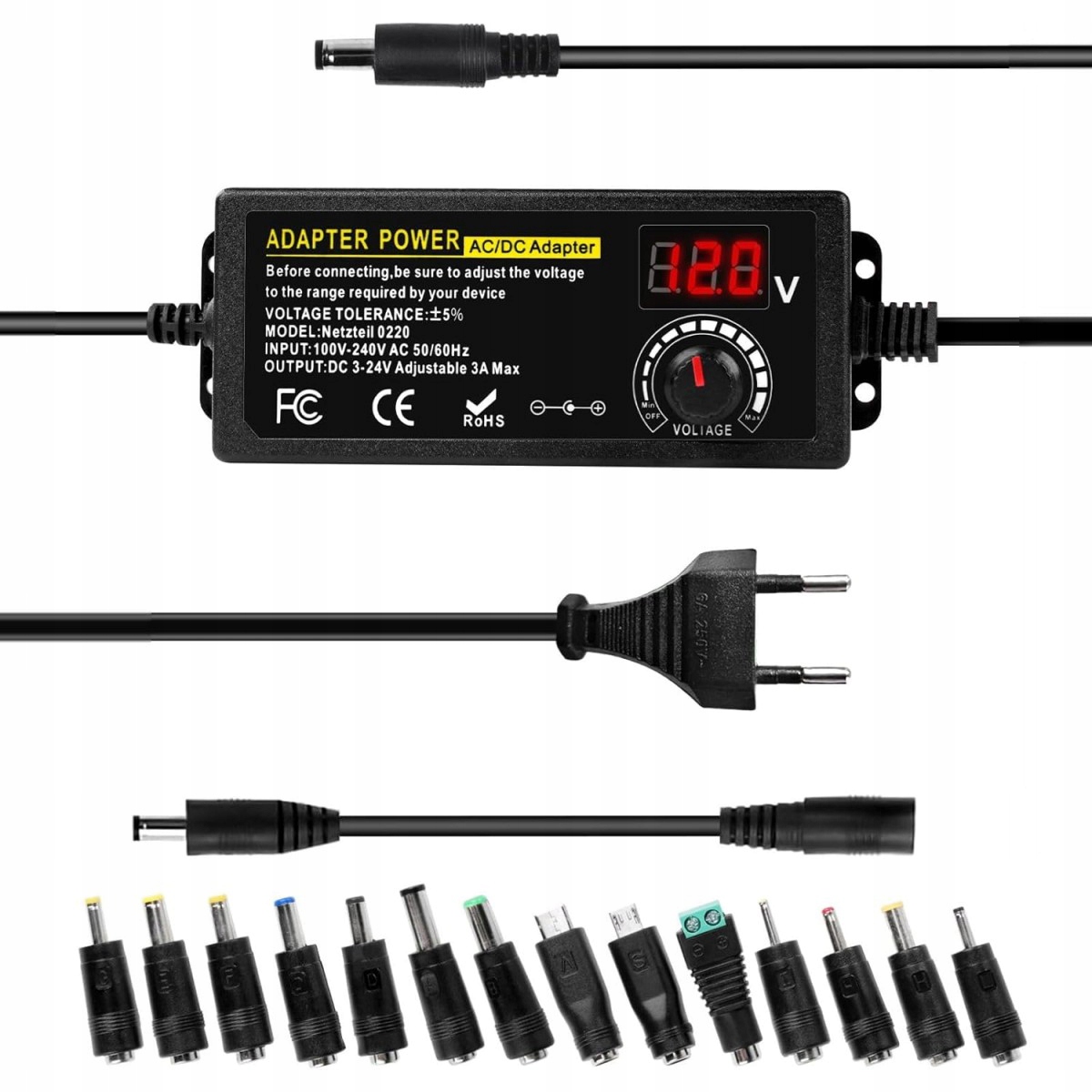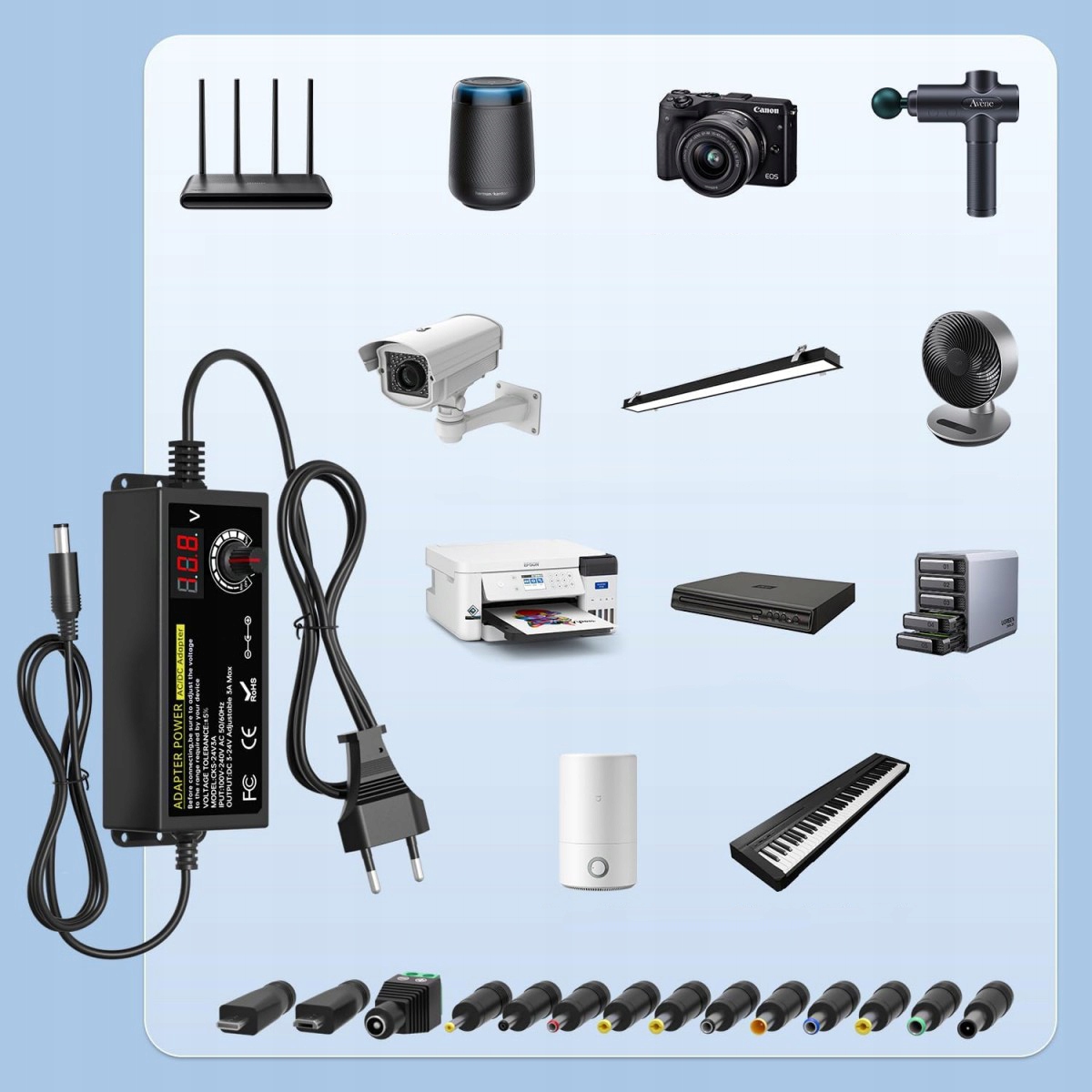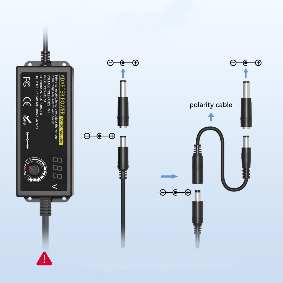 Адаптер живлення 3 В ~ 24 В 3 A 72 Вт Цей універсальний блок живлення змінного/постійного струму на 72 Вт підходить для лінійних двигунів постійного струму, водяних насосів постійного струму, світлодіодних стрічок, освітлення під шафою, телеприставок, маршрутизаторів Wi-Fi та іншої побутової техніки, дифузорів ефірних масел, зволожувачів повітря, USB-вентилятори, камери Wi-Fi, USB-концентратори, декодери жорстких дисків, цифрові піаніно, системи моніторингу DVR/NVR тощо, а також інші пристрої з енергоспоживанням менше 72 Вт. Адаптер не можна використовувати для заряджання пристроїв з живленням від акумулятора, оскільки він може пошкодити акумулятор.