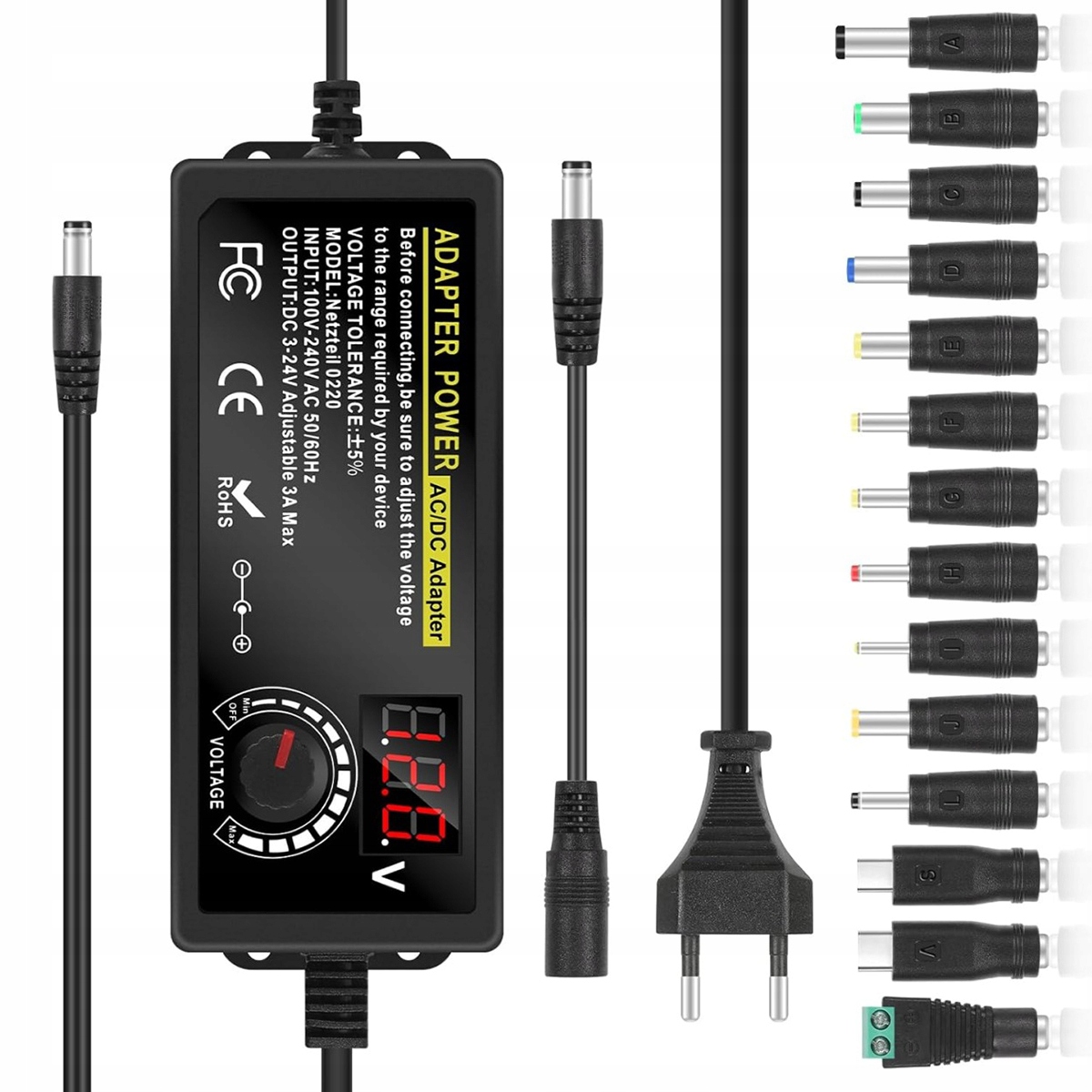 Вхід: 100 ~ 240 В змінного струму, 50/60 Гц, вихідна напруга 3 В ~ 24 В постійного струму, що регулюється. Максимальна потужність 3А, 72Вт; може видавати струми нижче 3 А, напр. 300 мА, 500 мА, 1 А, 1,5 А, 2 А, 2,5 А, 3 А. Виміряна вихідна напруга від 2,85 В до 25,2 В знаходиться в межах стандартного діапазону та є дійсною з допуском галузевого стандарту ±5%. Перш ніж підключати виріб, переконайтеся, що він сумісний із діапазоном напруги вашого пристрою.