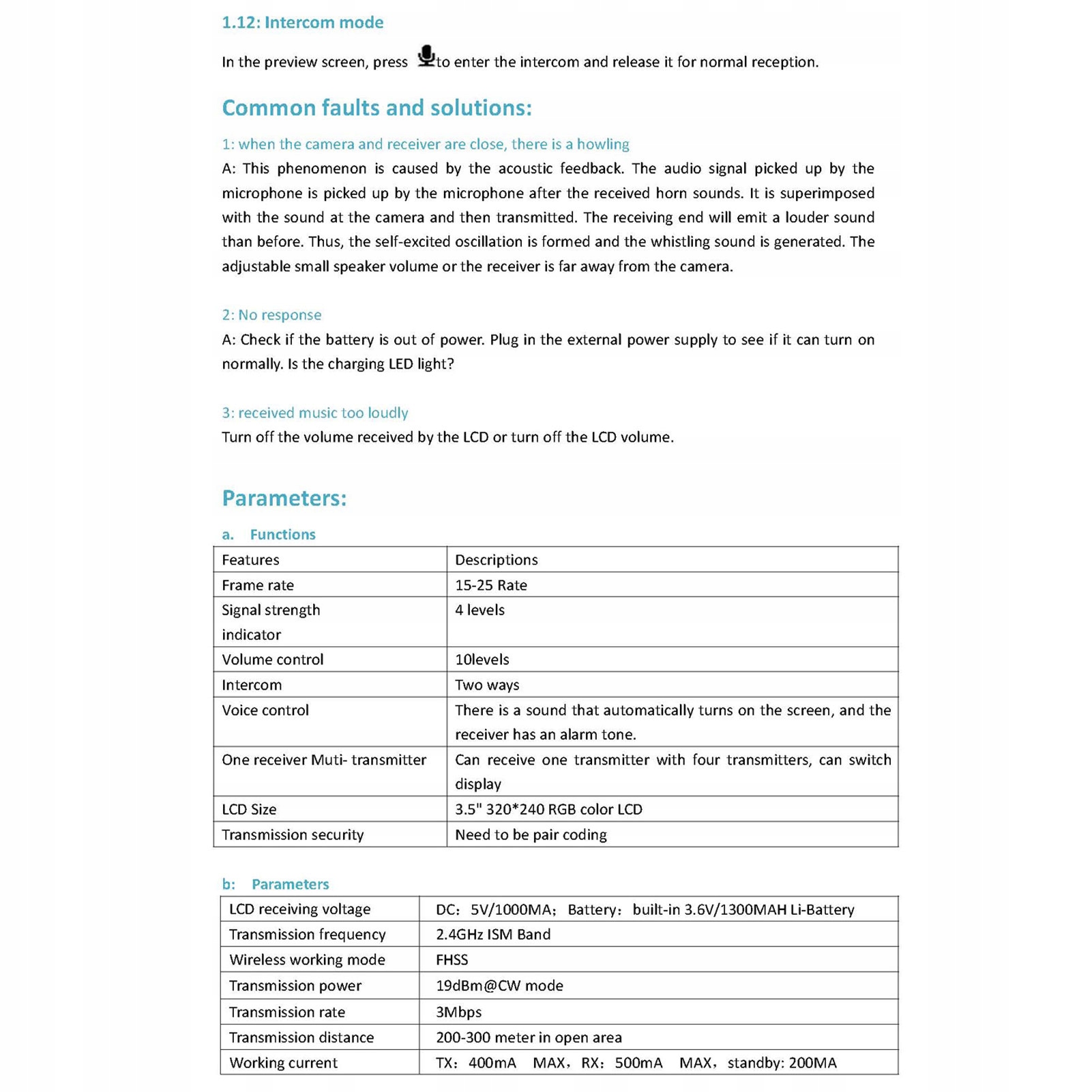 1. Передача в діапазоні 2,4 ГГц, відповідно до стандартів FCC та CE. 3,5-дюймовий дисплей з високою роздільною здатністю. Відображення меню обслуговування. Чотири передавачі можна підключити до одного приймача. Трансляція на великих відстанях. Діапазон відкритих передач до 150-200 м. Чітке бачення вночі, 24 -годинний моніторинг. Голосова передача, чиста якість звуку. Завдяки функції неспання Vox (голосовий контроль), гучність на стороні дитини запустить РК -приймач (звук буде легким після автоматичного вимикання екрана), нагадуючи батькам про перевірку стану дитини. Приймач працює від літієвих акумуляторів, що полегшує використання мобільного використання. Завдяки паролю, покращити безпеку та конфіденційність. Підтримка відтворення музики.