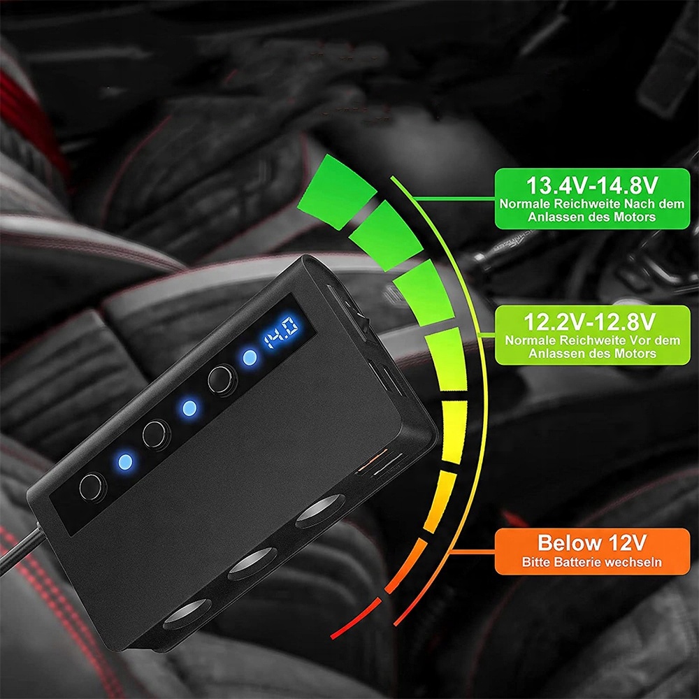 🚗【Моніторинг напруги】Розподільник прикурювача має функцію індикатора напруги, автомобіль запускається, живлення вмикається, світлодіодний дисплей автоматично контролює акумулятор автомобіля. Коли напруга автомобільного акумулятора нижча за 10,5 В або вища за 14,6 В, цифра блимає на дисплеї для попередження.